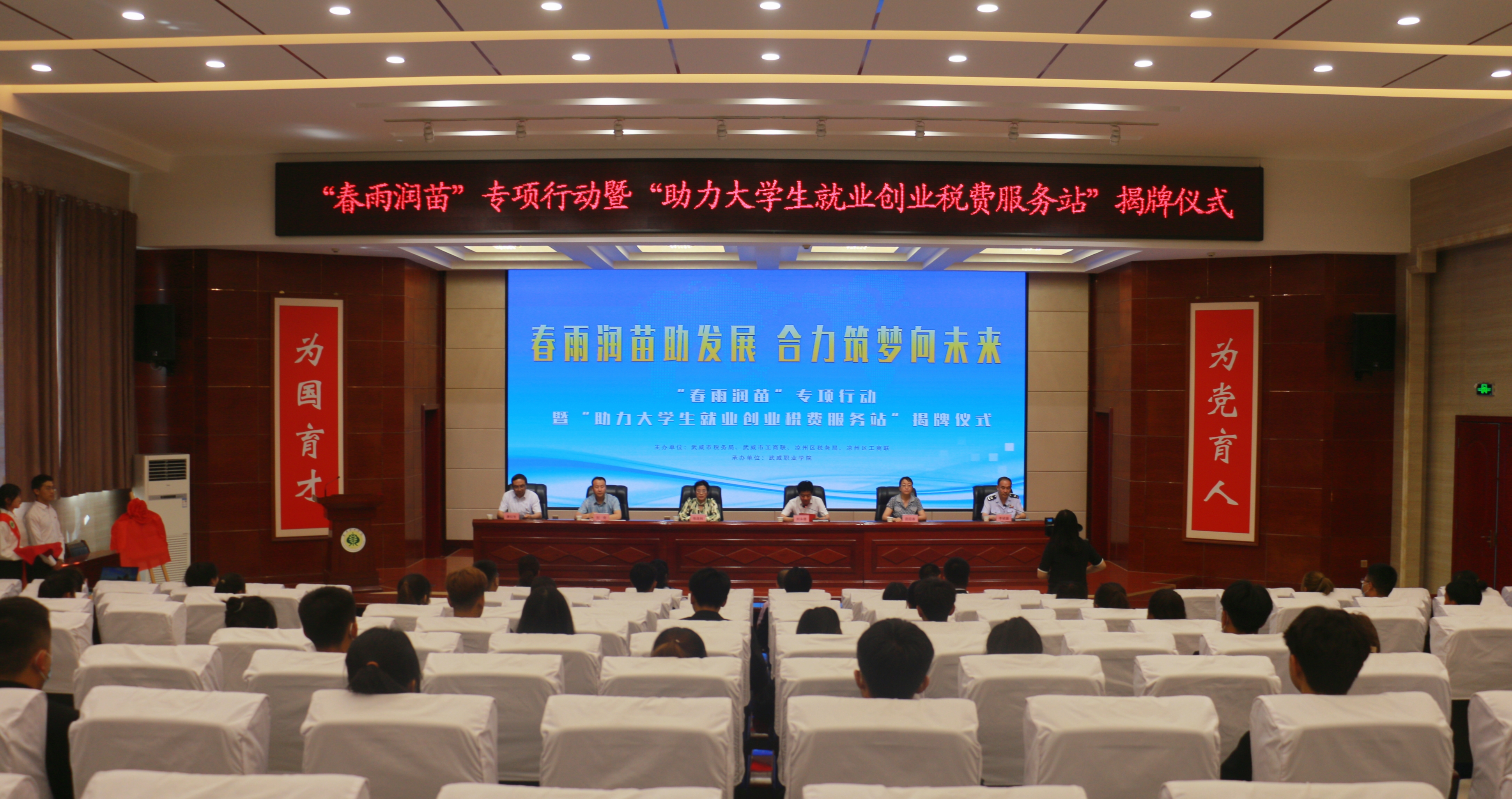 6月10日下午,武威市稅務(wù)局聯(lián)合工商聯(lián)在學(xué)校菁英廳舉辦“春雨潤苗”專項行動暨“助力大學(xué)生就業(yè)創(chuàng)業(yè)稅費服務(wù)站”揭牌儀式。武威市稅務(wù)局黨委委員、副局長劉永德,武威市工商聯(lián)副主席張連科,涼州區(qū)工商聯(lián)副主席唐紅生,學(xué)校黨委委員、副校長田迎春出席揭牌儀式,涼州區(qū)稅務(wù)局黨委委員、副局長李斌盛主持活動。武威市稅務(wù)局黨委委員、副局長劉永德在講話中指出“助力大學(xué)生就業(yè)創(chuàng)業(yè)稅費服務(wù)站”的成立,既是武威稅務(wù)部門優(yōu)化稅費服務(wù)的有力舉措,也是學(xué)院、工商聯(lián)和稅務(wù)的一次深入合作,更是三方匯聚合力,助力穩(wěn)就業(yè)、保民生、促發(fā)展的積極作為?!?/p>