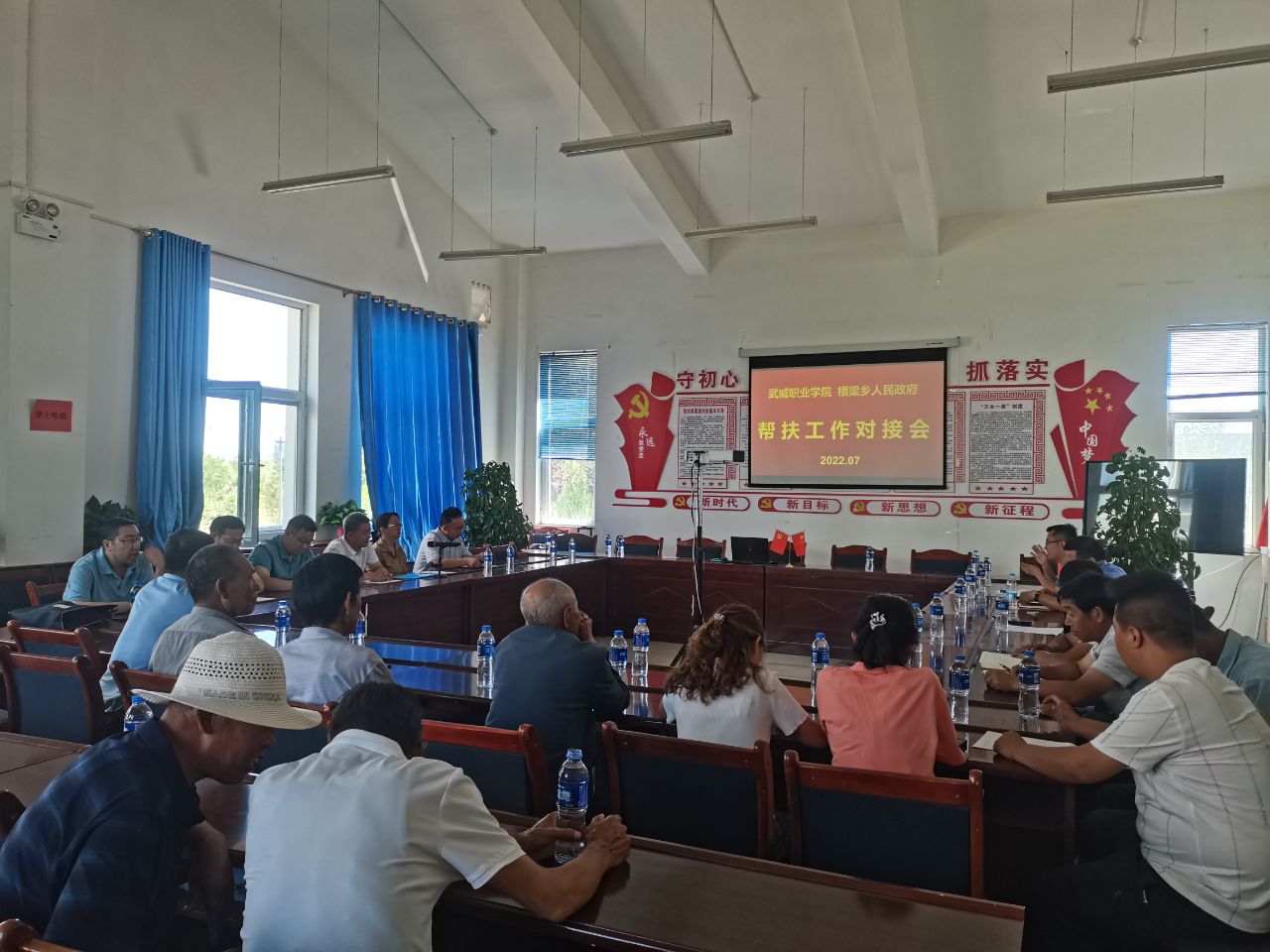 學校領導、橫梁鄉(xiāng)鄉(xiāng)長張熹中、黨委副書記王劍及幸福新村、康寧新村干部、村民代表召開推進鄉(xiāng)村振興工作座談會。張熹中、王劍代表橫梁鄉(xiāng)對學校及駐村工作隊在鄉(xiāng)村振興中的幫扶工作表示感謝,特別是結合鄉(xiāng)村學校、文化需求,為橫梁鄉(xiāng)完成游園文化墻彩繪,在綠洲小學、古浪四中成立音樂、武術社團,為推進鄉(xiāng)村振興發(fā)揮了重要作用。