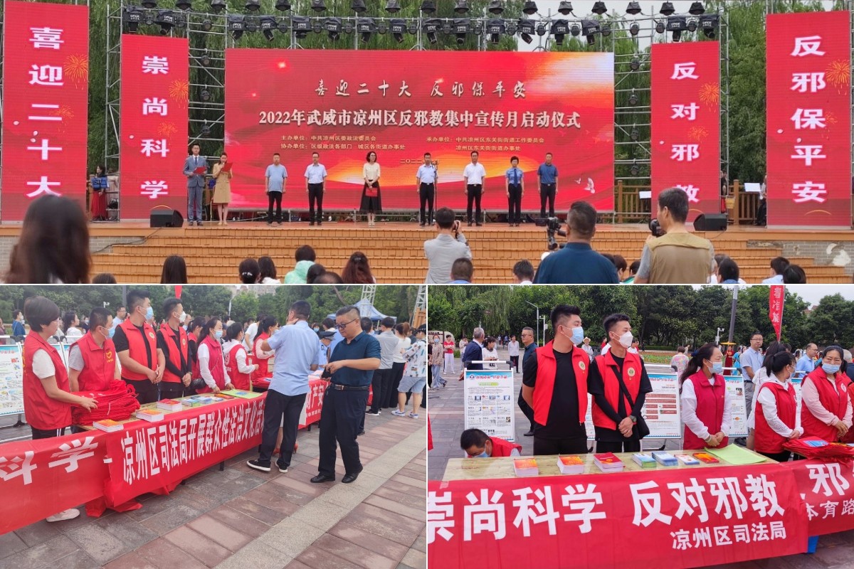 12日上午8點,宣傳月活動準時在涼州區(qū)植物園開始?;顒悠陂g,學生積極配合區(qū)司法局懸掛反邪教橫幅、擺放各類反邪教宣傳展板、向市民群眾發(fā)放《反邪教倡議書》及宣傳彩頁資料和宣傳手提袋,現(xiàn)場接受群眾咨詢160余人次,使廣大群眾認識到邪教的危害,教育引導群眾崇尚科學、遠離邪教,做到不聽、不看、不信、不傳。寓教于樂的反邪教文藝節(jié)目在活動現(xiàn)場精彩紛呈,反響熱烈。