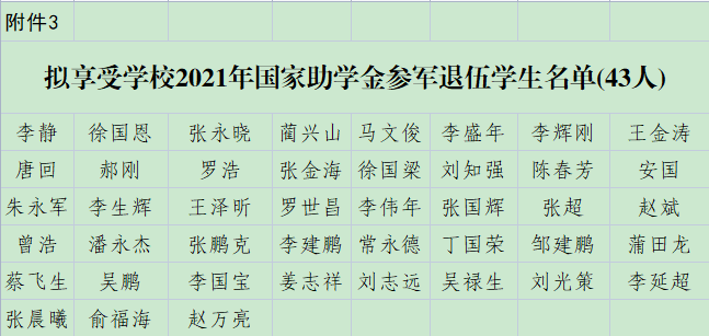 ???? 根據(jù)《甘肅省財政廳 甘肅省教育廳關于下達 2021年學生資助補助經(jīng)費(第二批)的通知》(甘財教〔2021〕68號)和《甘肅省學生資助資金管理辦法》(甘財教〔2022〕20號)文件要求,學生工作處擬對2019—2020學年符合資助條件的23名退役學生每人補發(fā)助學金3300元,共計75900元;對2020—2021學年符合資助條件的120名退役學生每人補發(fā)助學金3300元,共計396000元;對2021—2022學年符合資助條件的43名退役學生每人補發(fā)助學金3300元,共計141900元?,F(xiàn)向廣大師生進行公示。