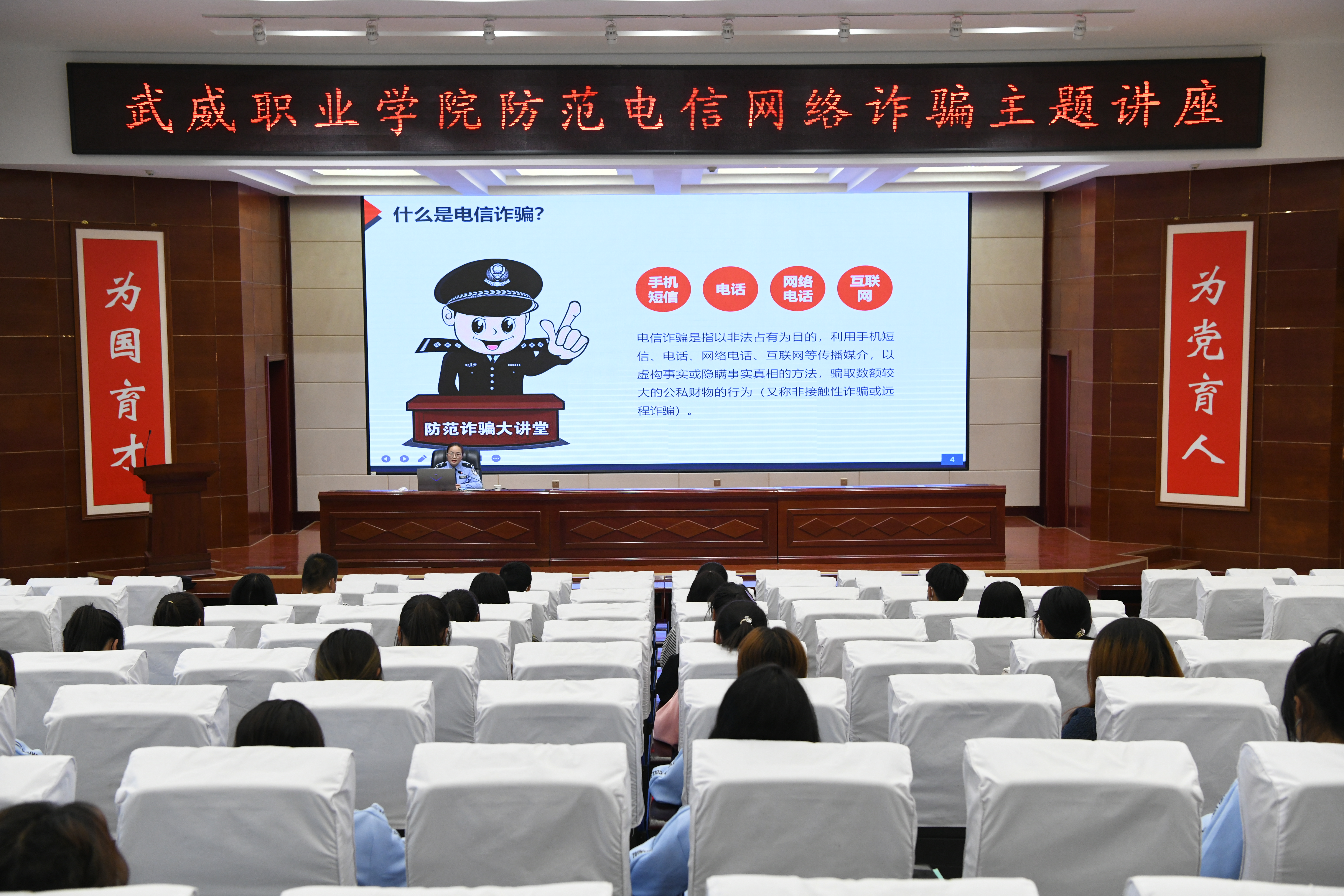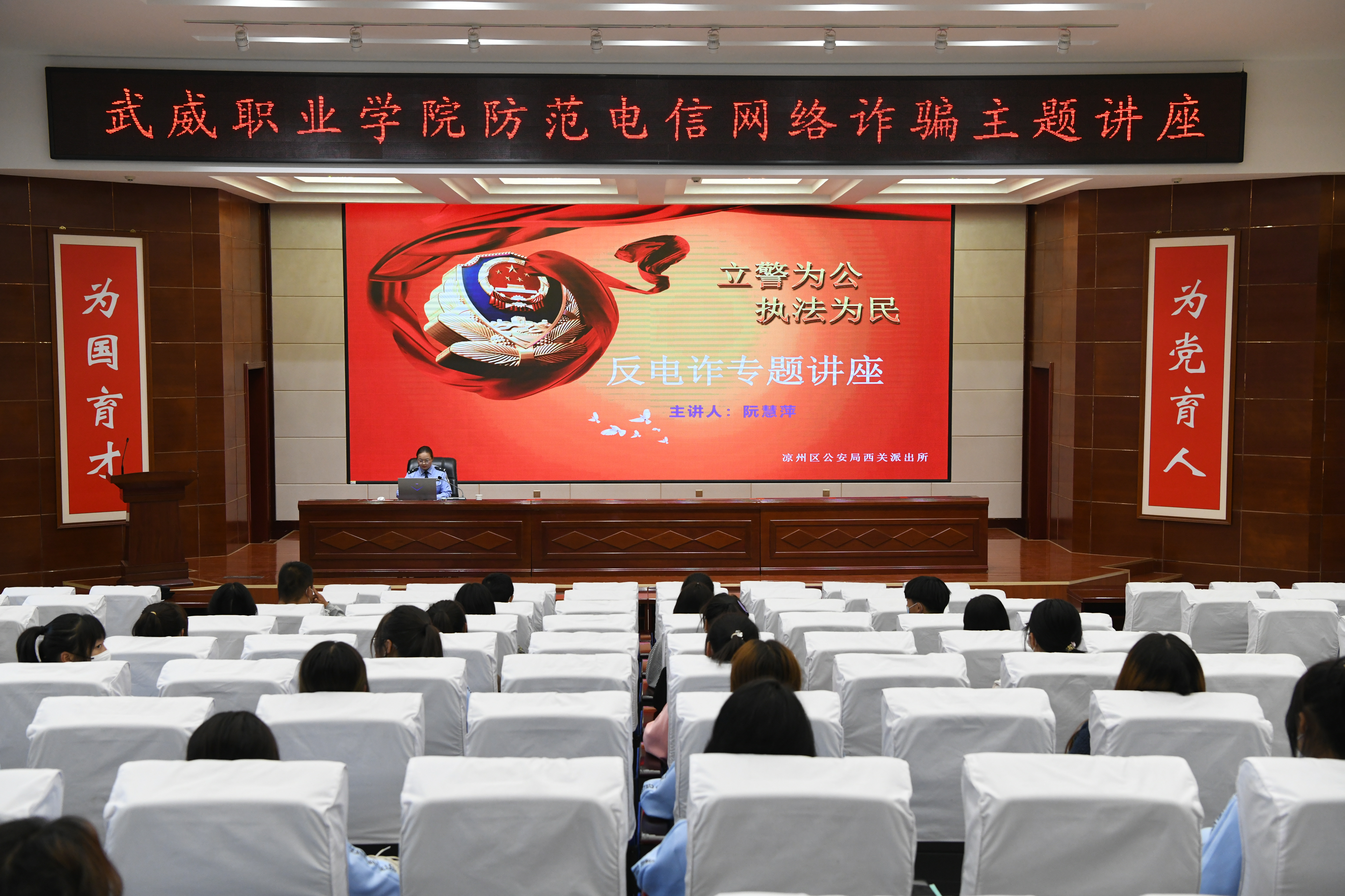 為了提高學(xué)校師生識別和防范電信網(wǎng)絡(luò)詐騙的能力,切實做好防范電信網(wǎng)絡(luò)詐騙宣傳教育工作。9月30日,學(xué)校聯(lián)合武威市公安局涼州分局西關(guān)派出所在學(xué)生發(fā)展中心菁英廳舉辦防范電信網(wǎng)絡(luò)詐騙專題講座。各二級學(xué)院師生代表聆聽了講座,講座由安全保衛(wèi)處負責(zé)人李欣主持。