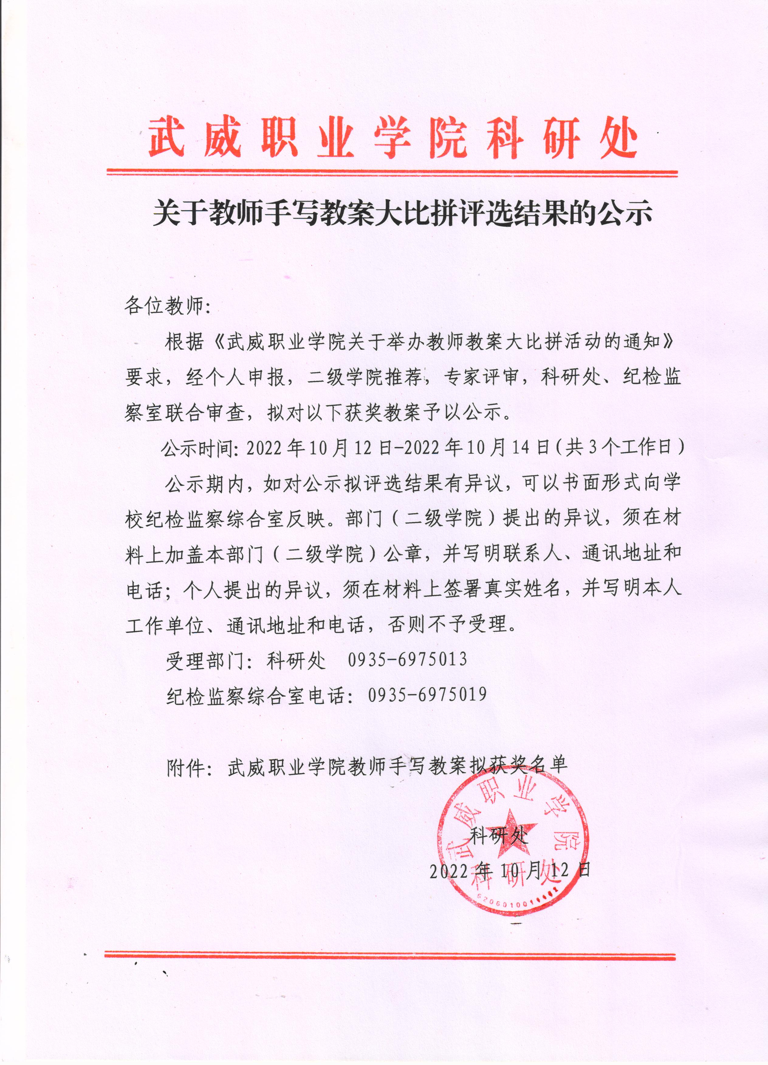 關(guān)于教師手寫教案打比賽評(píng)選結(jié)果的公示