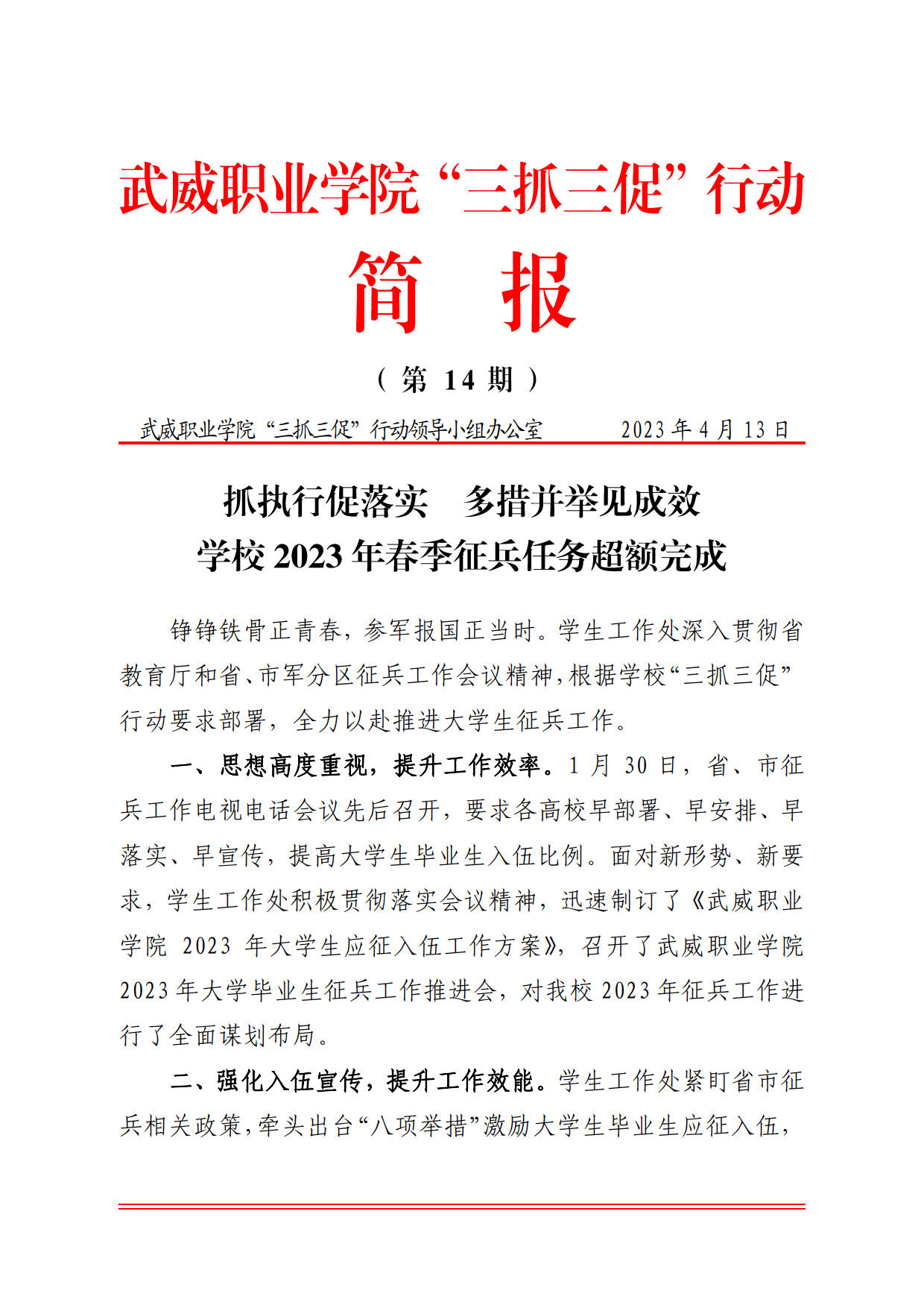 簡報第14期:抓執(zhí)行促落實 多措并舉見成效 學(xué)校2023年春季征兵任務(wù)超額完成