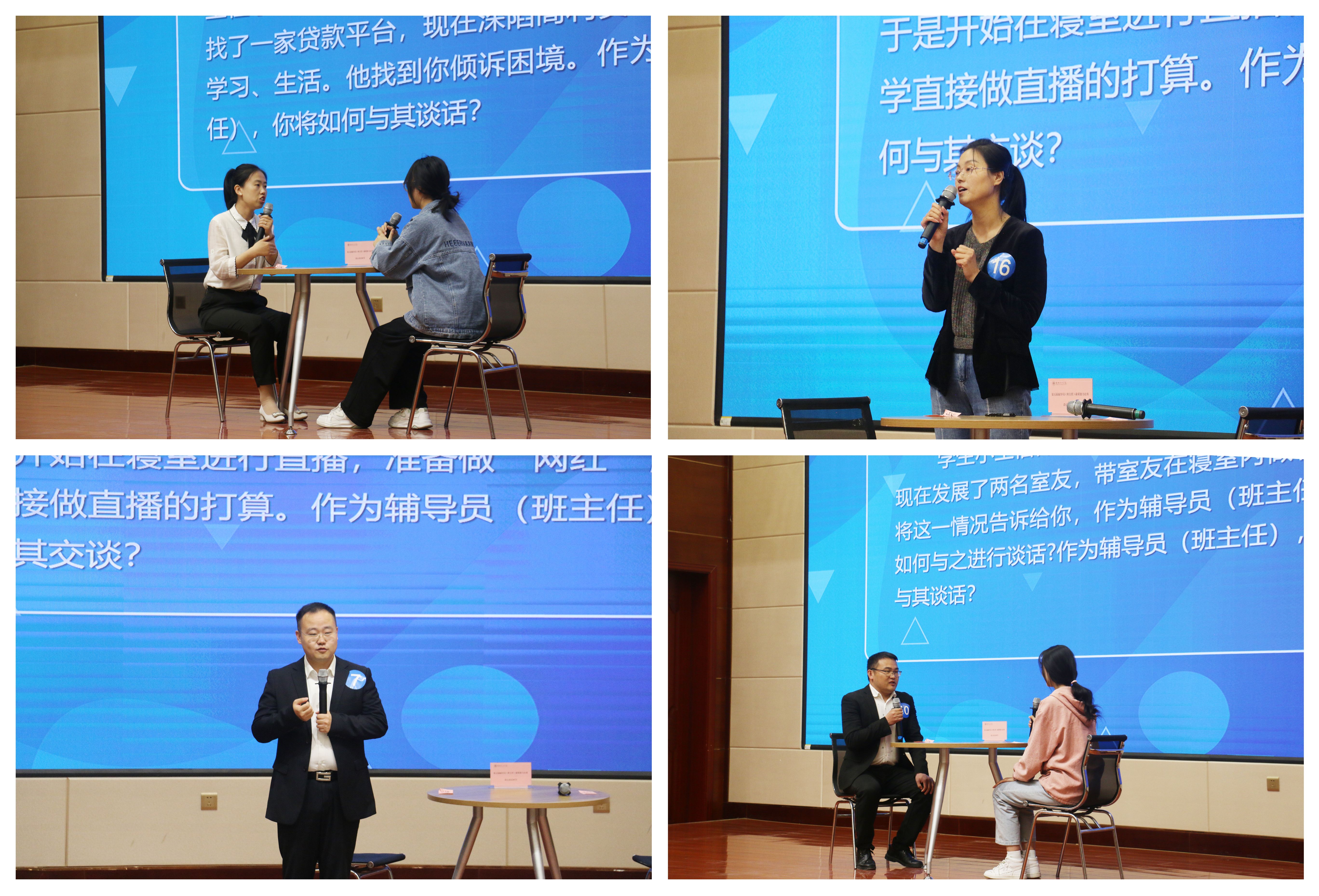 4月20日,談心談話環(huán)節(jié)在菁英廳進行。比賽中,面對“問題百變”的參演學(xué)生,參賽選手從學(xué)生特征、學(xué)生成長、成才規(guī)律等方面進行了耐心、細致的談心談話,充分展示了輔導(dǎo)員、班主任對學(xué)生的教育引導(dǎo)、解決思想困惑和處理實際問題的能力。