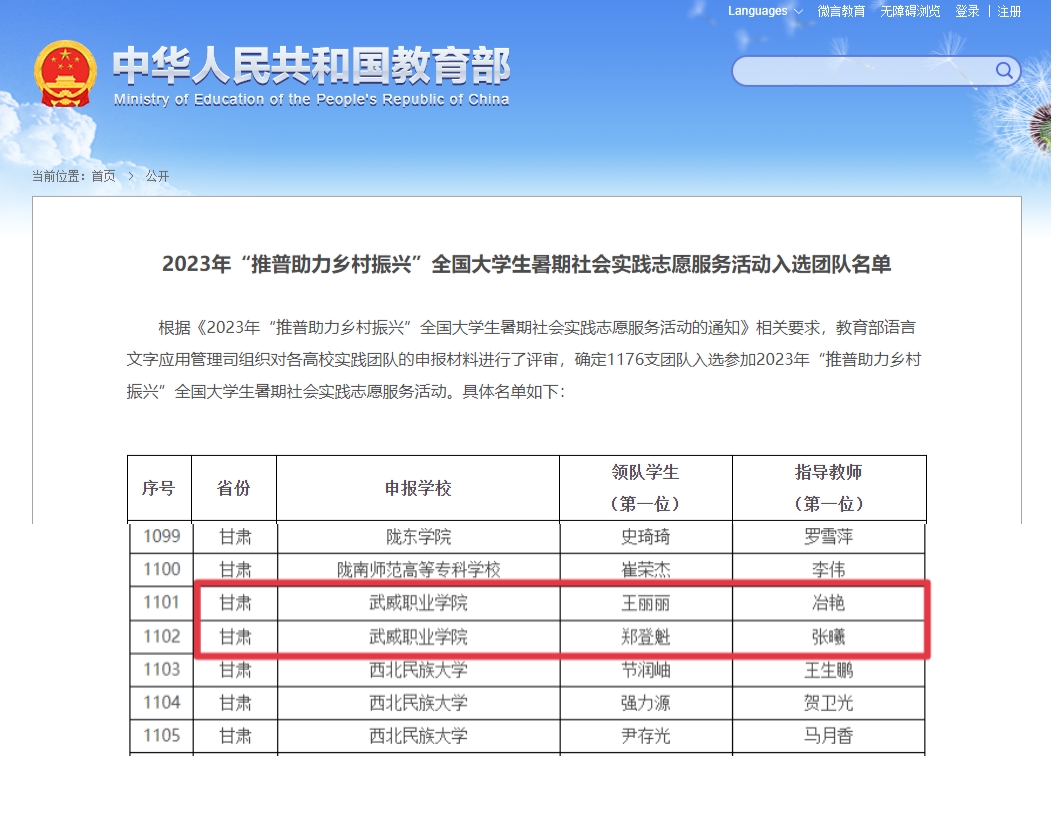 根據(jù)《2023年“推普助力鄉(xiāng)村振興”全國(guó)大學(xué)生暑期社會(huì)實(shí)踐志愿服務(wù)活動(dòng)的通知》相關(guān)要求,近日,教育部語(yǔ)言文字應(yīng)用管理司組織對(duì)各高校實(shí)踐團(tuán)隊(duì)的申報(bào)材料進(jìn)行了評(píng)審,確定1176支團(tuán)隊(duì)入選參加2023年“推普助力鄉(xiāng)村振興”全國(guó)大學(xué)生暑期社會(huì)實(shí)踐志愿服務(wù)活動(dòng)。我?!蓖破砧T民團(tuán)隊(duì)”“推普助力鄉(xiāng)村振興實(shí)踐團(tuán)”成功入選。