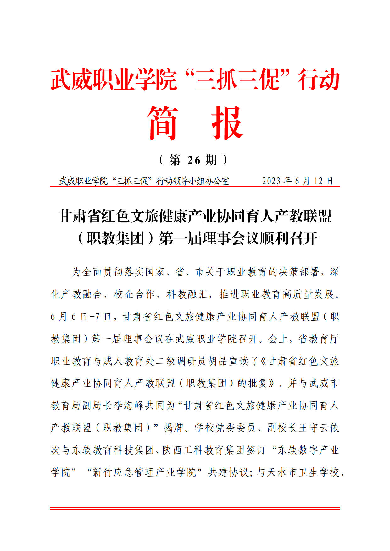 簡(jiǎn)報(bào)第26期:甘肅省紅色文旅健康產(chǎn)業(yè)協(xié)同育人產(chǎn)教聯(lián)盟(職教集團(tuán))第一屆理事會(huì)議順利召開