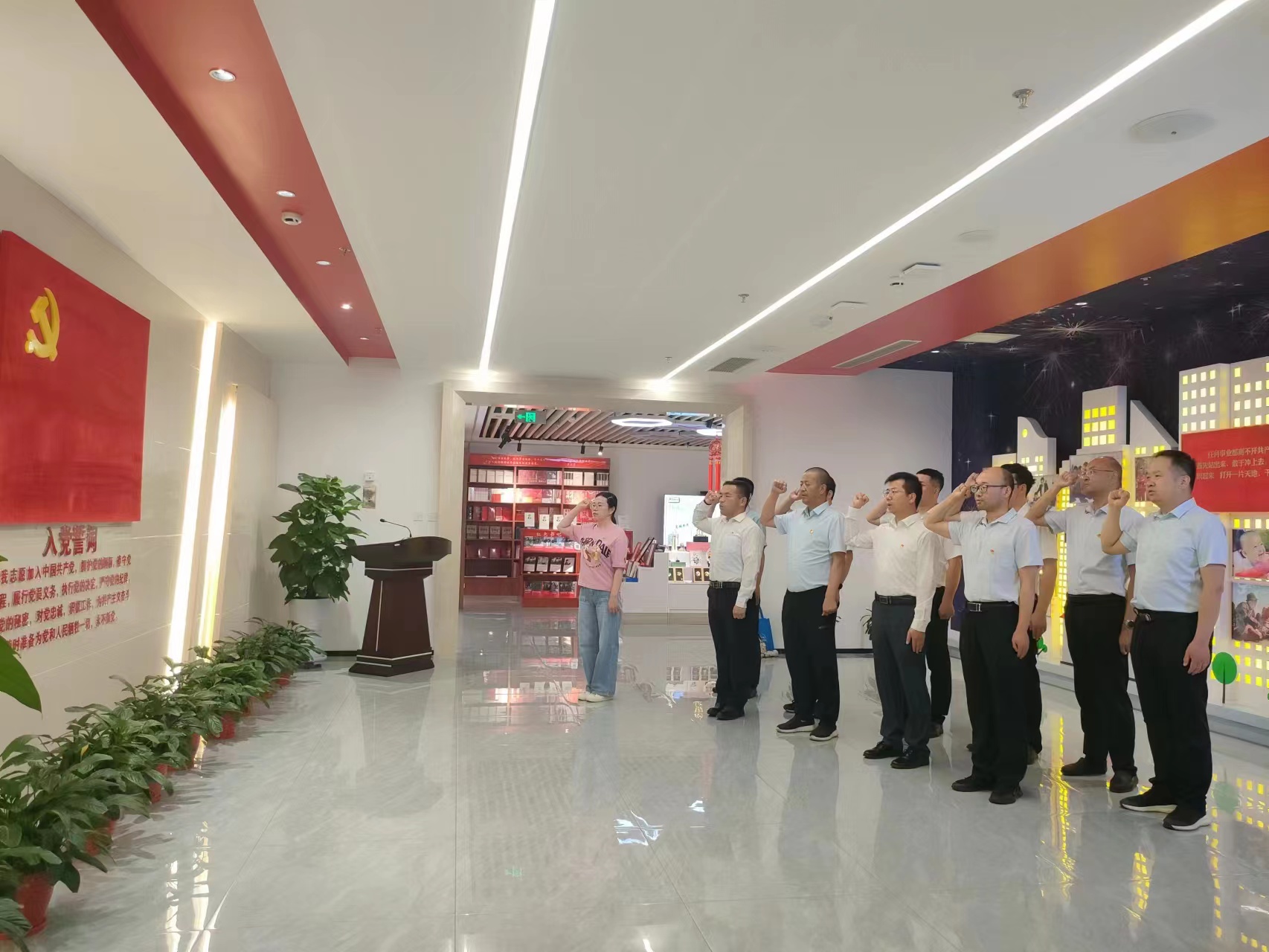參觀結(jié)束后,在鮮紅的黨旗下,全體黨員舉起右拳,重溫入黨誓詞。一句句鏗鏘的誓言、一個(gè)個(gè)緊握的拳頭、一枚枚閃亮的黨徽,深情表達(dá)著對(duì)黨的無(wú)限熱愛(ài)和聽黨話、感黨恩的決心。