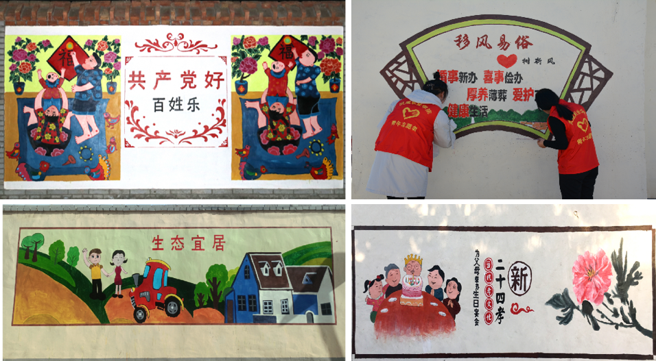 自2019 年以來,武威職業(yè)學院堅持“立足地方、融入地方、服務(wù)地方”的發(fā)展理念,將優(yōu)勢學科專業(yè)與武威市經(jīng)濟社會發(fā)展緊密結(jié)合,組織師生開展“打造人文美居助力鄉(xiāng)村振興”墻體彩繪志愿服務(wù)項目,通過墻體彩繪反映黨的領(lǐng)導(dǎo)下農(nóng)村精神風貌的變化和取得的成就,將村莊重點街巷屋面墻體繪制出一幅幅反映美麗鄉(xiāng)村建設(shè)、社會主義核心價值觀、移風易俗、鄉(xiāng)風文明等為主題的墻體畫,形象生動、 通俗易懂的內(nèi)容讓村民變“被動學”為“主動看”,不僅展現(xiàn)了農(nóng)村新生活、農(nóng)業(yè)新氣象、農(nóng)民新面貌,美化了村容村貌,為美麗鄉(xiāng)村建設(shè)、人居環(huán)境美化添磚加瓦。