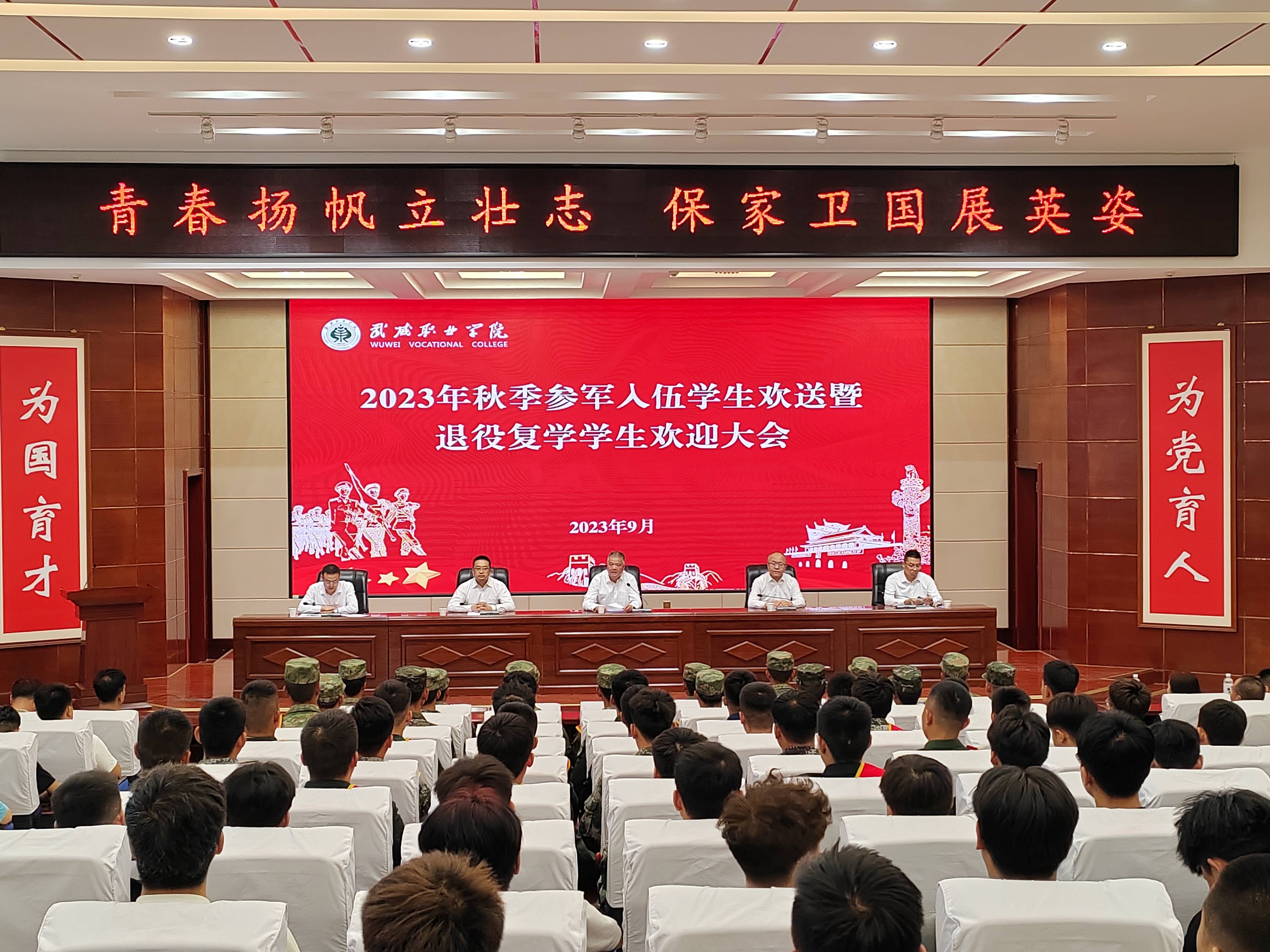 學(xué)校相關(guān)部門負(fù)責(zé)人,2023年秋季在涼州區(qū)參軍入伍學(xué)生,近兩年退役復(fù)學(xué)學(xué)生,入伍學(xué)生家長代表,二級學(xué)院輔導(dǎo)員、入伍學(xué)生班主任,以及學(xué)生代表共200余人參加了大會。