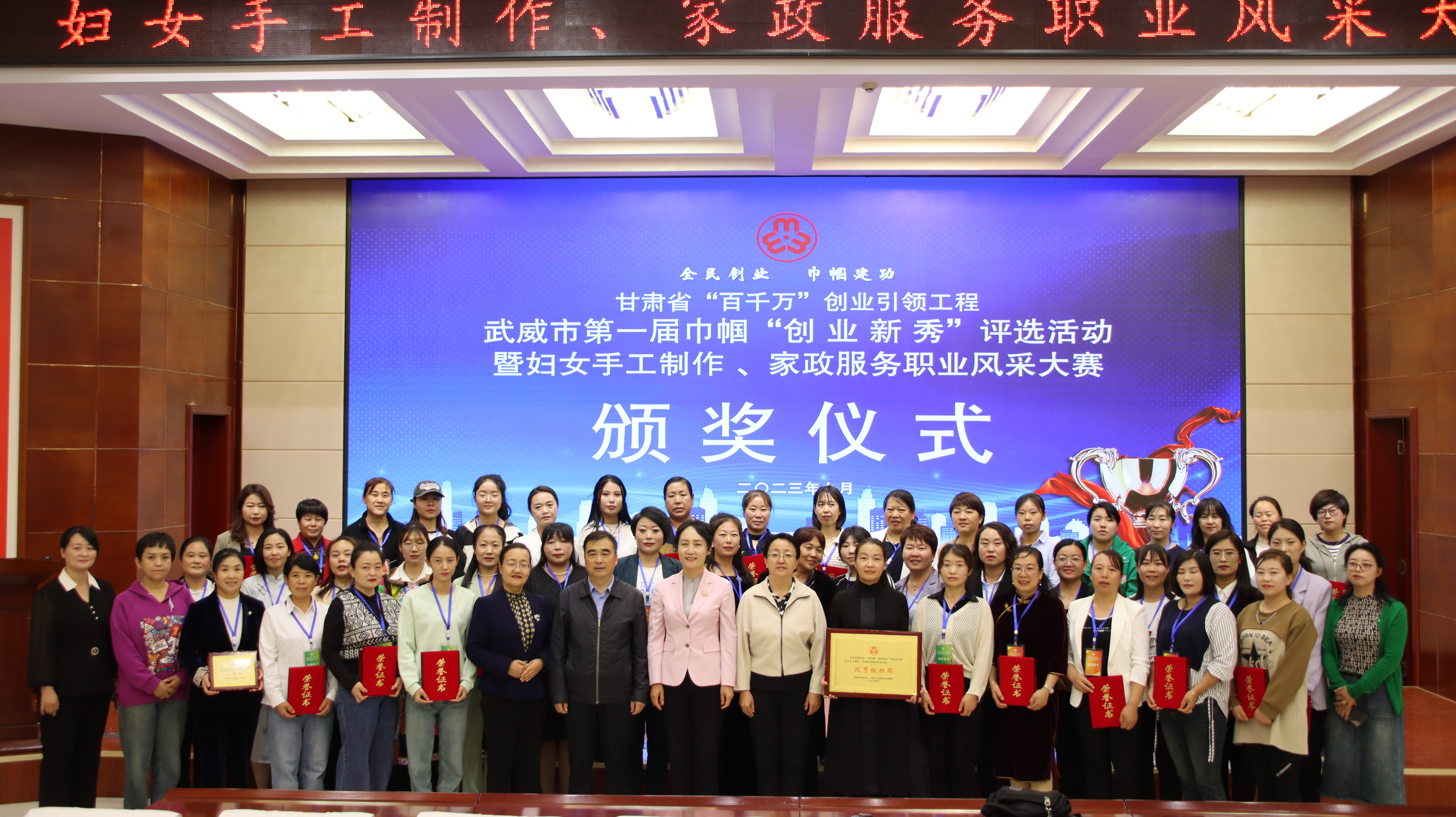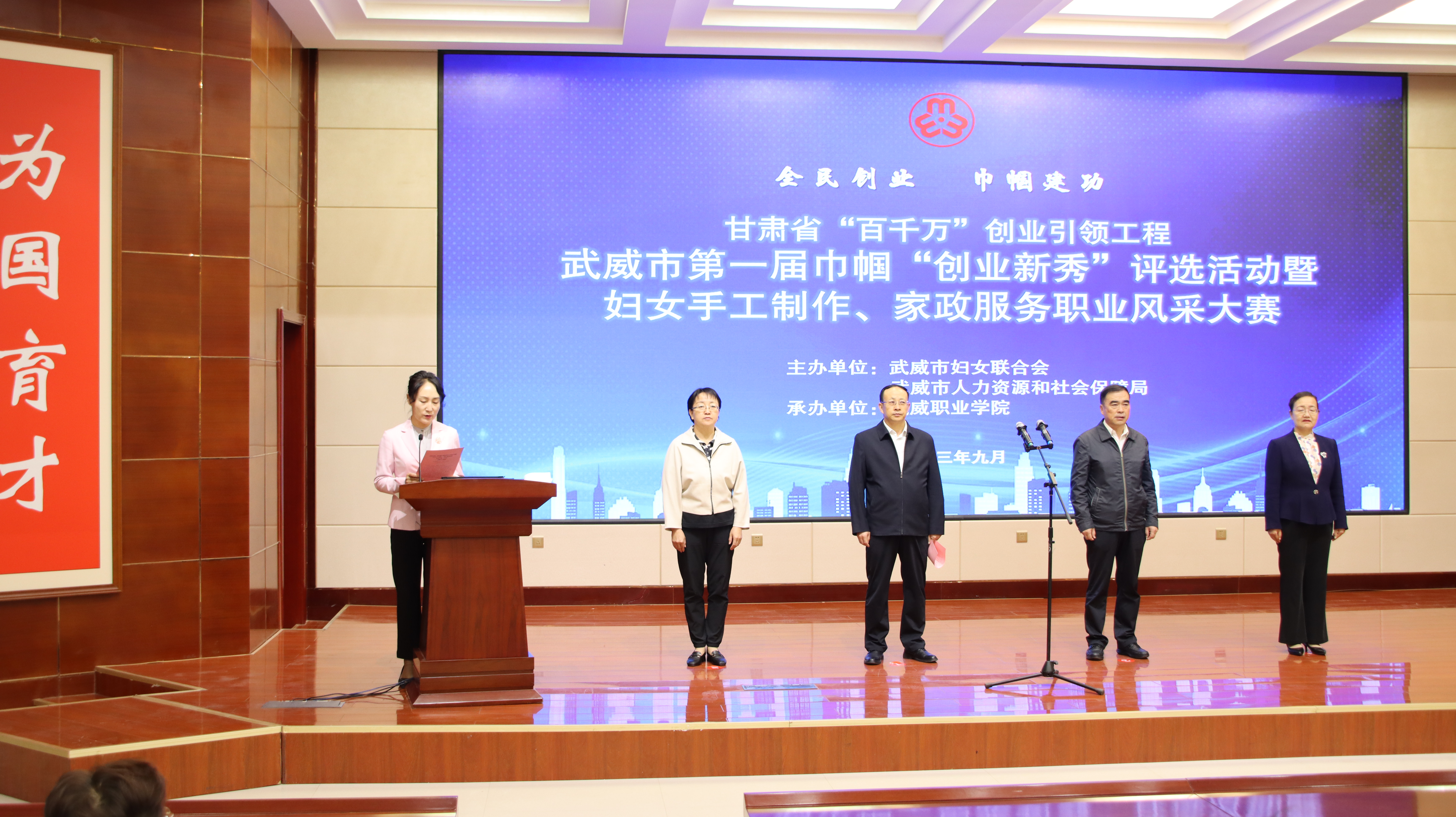 9 月 27 日,由市婦聯(lián)、市人社局主辦、我校承辦的甘肅省“百千萬”創(chuàng)業(yè)引領(lǐng)工程武威市第一屆巾幗“創(chuàng)業(yè)新秀”評選活動暨婦女手工制作、家政服務(wù)職業(yè)風采大賽成功舉辦,武威市人社局黨組書記,局長陳昱川,市婦聯(lián)黨組書記,主席劉玉華,武威市就業(yè)局局長魏斌,武威市婦聯(lián)副主席張惠華,縣區(qū)婦聯(lián)負責同志,學校黨委委員,副校長田迎春出席本次活動,參賽選手等100 人參加大賽。