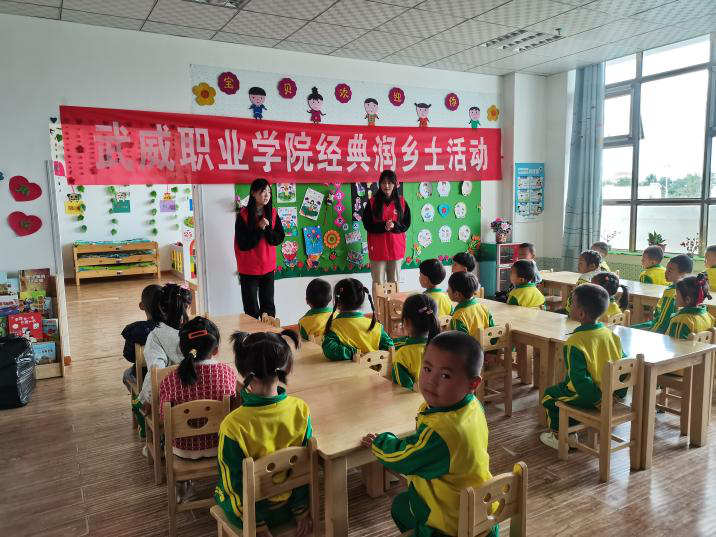學(xué)校組織推普志愿團(tuán)隊(duì)學(xué)生赴古浪綠洲小鎮(zhèn)第一幼兒園開(kāi)展了經(jīng)典浸潤(rùn)?quán)l(xiāng)土特色幫扶活動(dòng),以經(jīng)典詩(shī)文、兒歌、紅歌等語(yǔ)言小游戲和幼兒進(jìn)行了互動(dòng),并發(fā)放文具等禮品,激發(fā)了小朋友同講普通話的興趣。
