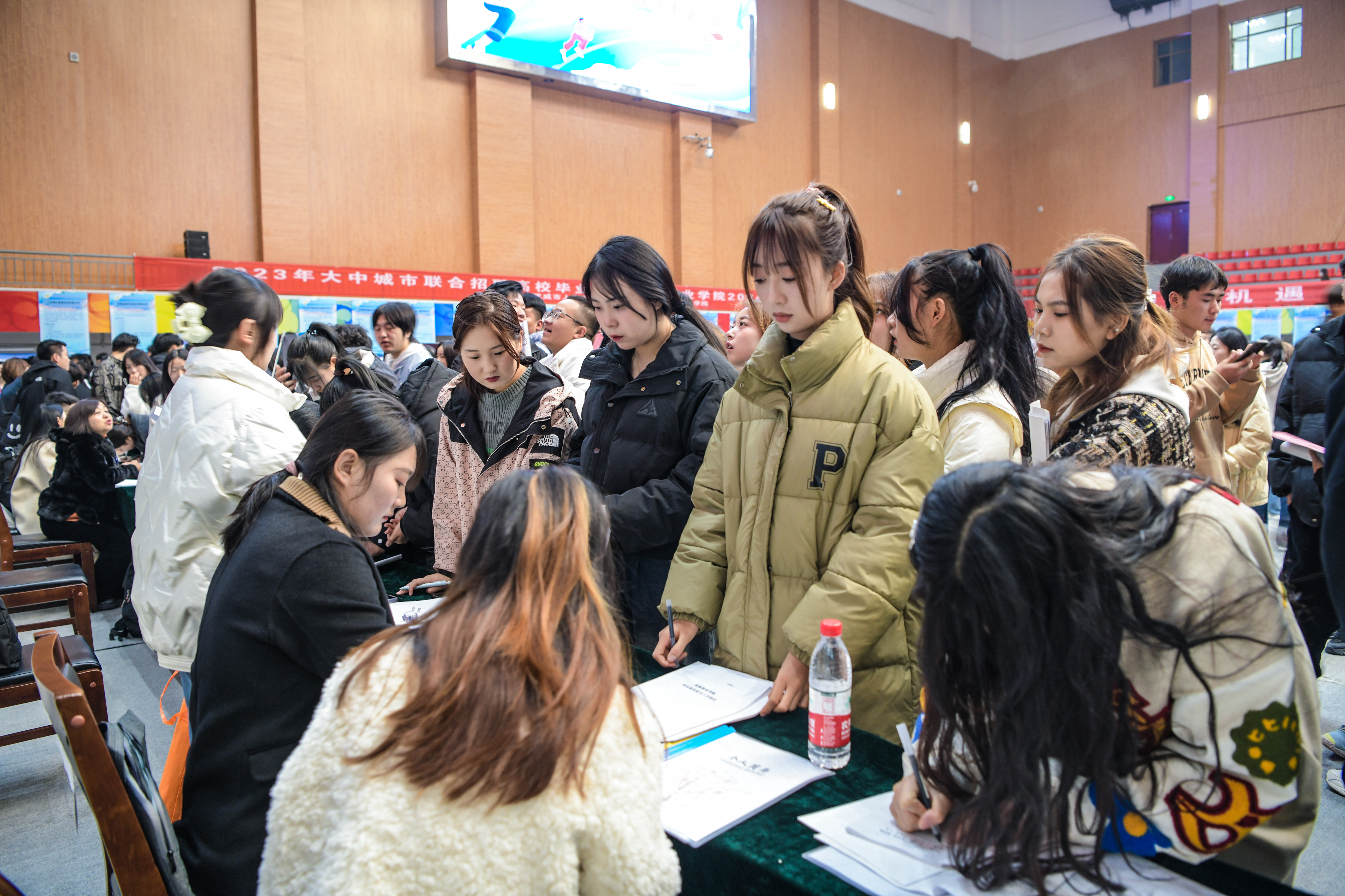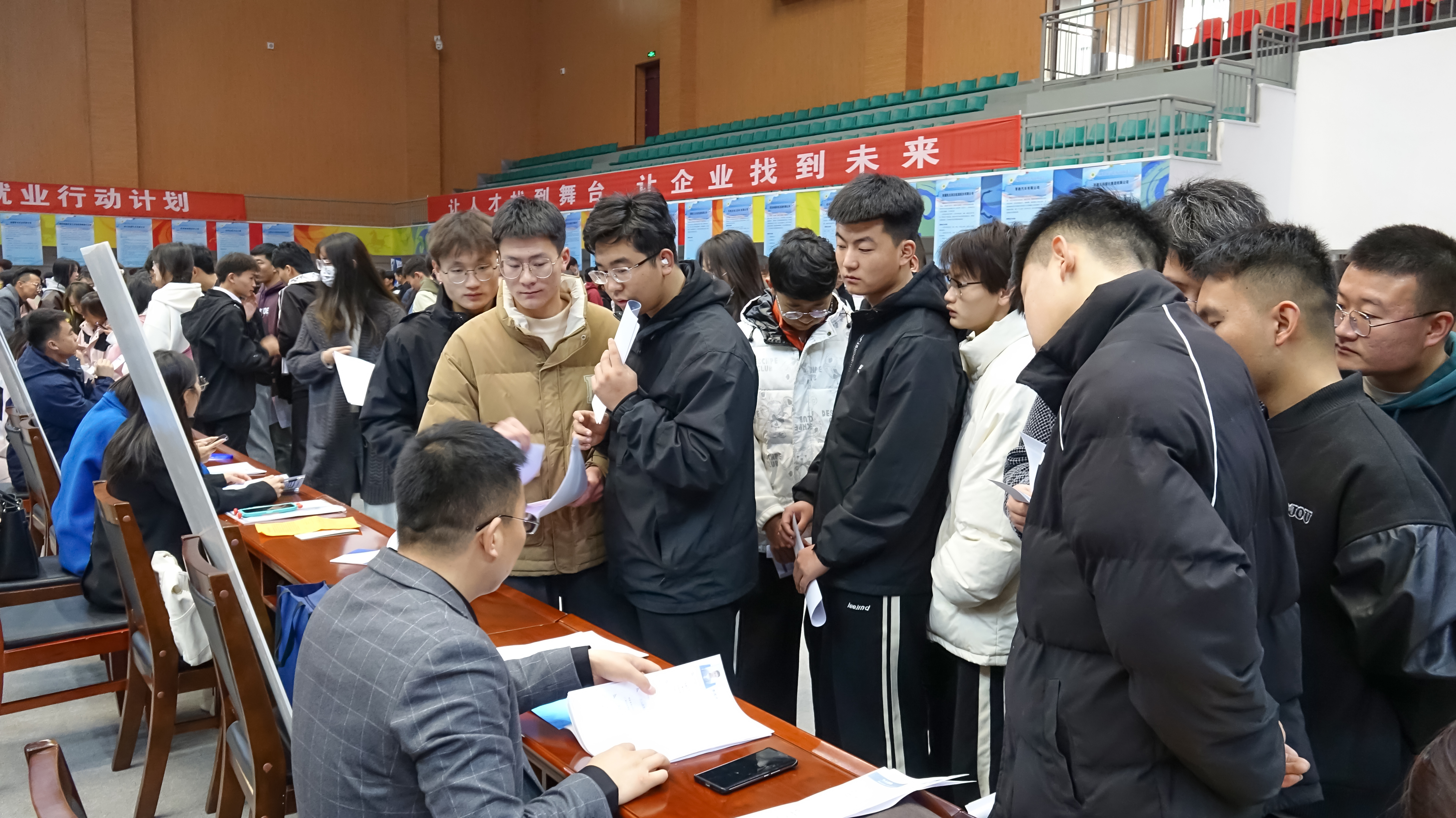 雙選會現(xiàn)場,學(xué)生志愿者耐心引導(dǎo)前來參會的同學(xué)入場求職。畢業(yè)生們來往于各招聘展位之間,與用人單位面對面交流,認真查看招聘信息,挑選自己心儀的工作崗位。會場里接踵比肩,氣氛十分熱烈。