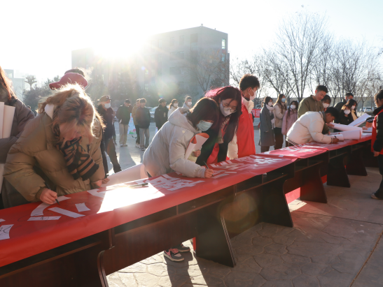 防艾知識宣傳志愿隊伍在大學生活動中心廣場發(fā)放宣傳手冊,制作并贈送紅絲帶標志400余個,活動中對300余名學生進行了免費艾滋病檢測。同學們一同在宣傳條幅上簽名,祝福語書滿了紅絲帶,一撇一捺、一筆一劃,都是無數的信念與期望的匯聚,是大家用無聲的行動承諾自己防艾的決心。