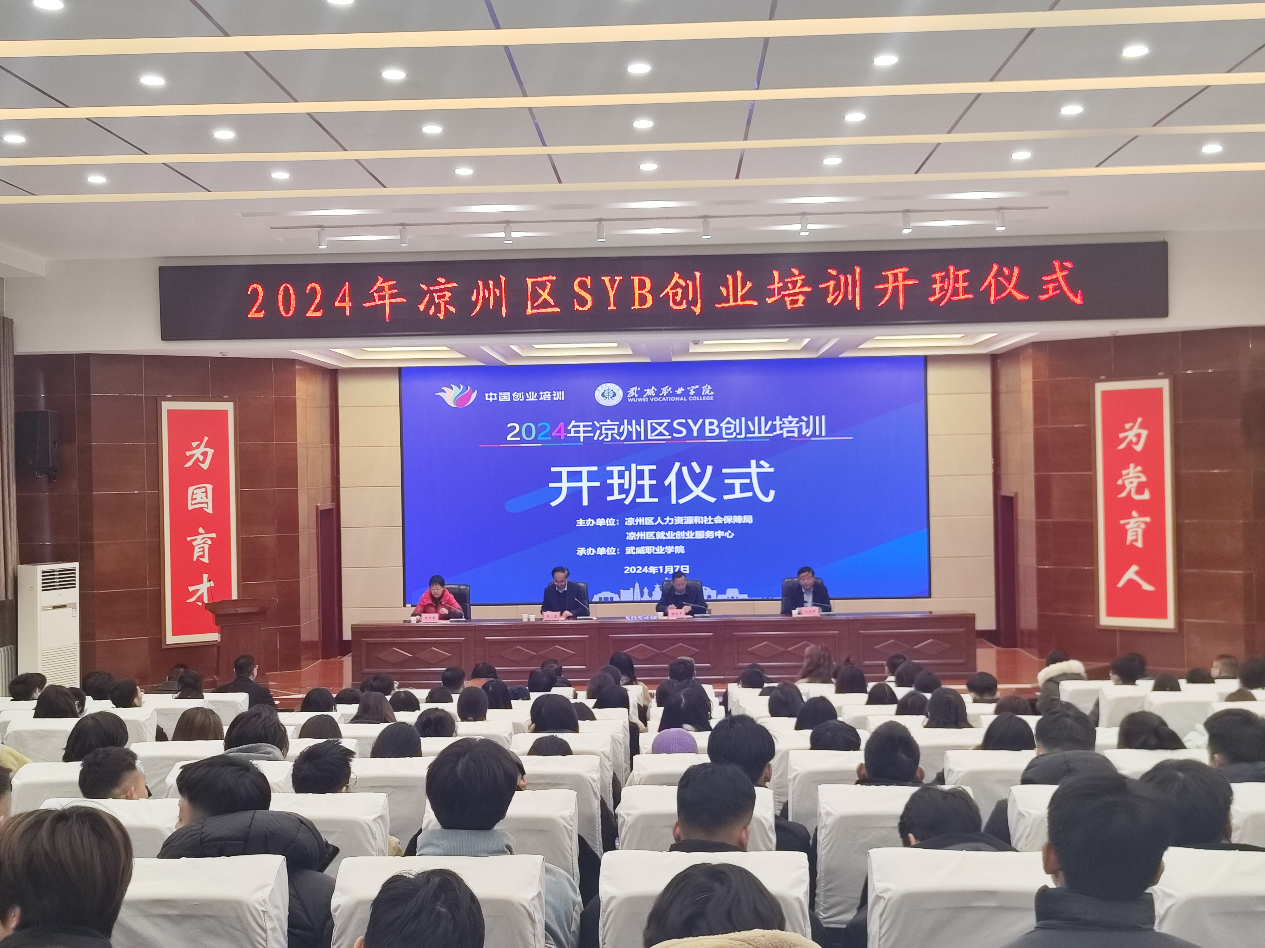 1月7日上午,由涼州區(qū)人社局、涼州區(qū)就業(yè)創(chuàng)業(yè)服務(wù)中心主辦,我校承辦的2024年涼州區(qū)SYB創(chuàng)業(yè)培訓(xùn)開班式在菁英廳舉行,學(xué)校黨委書記王宏,涼州區(qū)人社局黨組書記、局長藺銀平,涼州區(qū)人社局黨組成員、區(qū)就業(yè)創(chuàng)業(yè)服務(wù)中心主任劉學(xué)年,學(xué)校繼續(xù)教育學(xué)院、創(chuàng)新創(chuàng)業(yè)中心負(fù)責(zé)同志參加開班式,學(xué)校黨委委員、副校長田迎春主持開班式。培訓(xùn)講師代表,培訓(xùn)班班主任,培訓(xùn)學(xué)員代表等200余人參加了開班式。