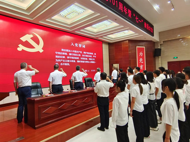 大會在嘹亮的國歌聲中拉開帷幕。面對鮮紅的黨旗,新黨員進(jìn)行入黨宣誓、老黨員重溫入黨誓詞。