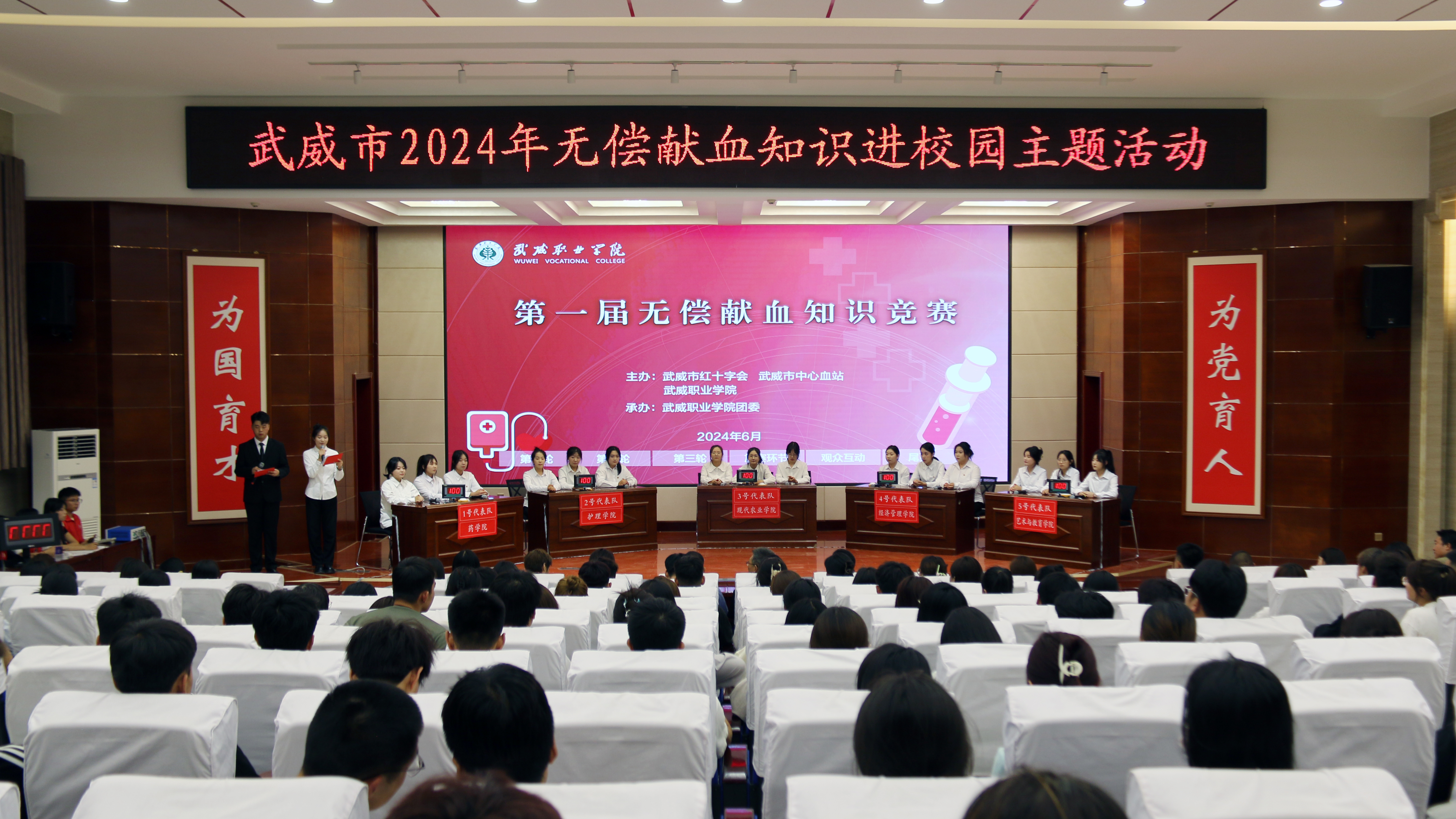 武威市紅十字會副會長張勇,武威市中心血站站長王磊,武威市中心血站副站長岳文清,學(xué)校黨委委員、副校長王永緒出席活動,各二級學(xué)院的200余名師生觀看比賽。