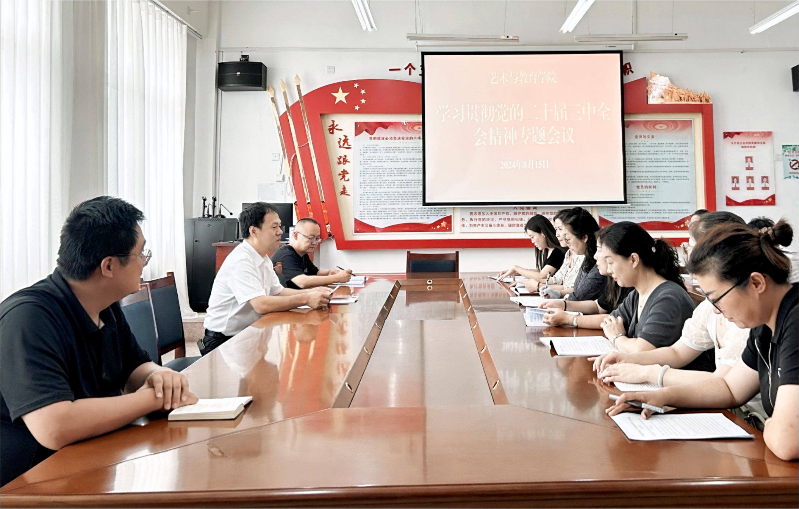 8月15日,藝術(shù)與教育學(xué)院召開黨的二十屆三中全會精神專題學(xué)習(xí)會議,傳達(dá)學(xué)習(xí)《習(xí)近平總書記關(guān)于<中共中央關(guān)于進(jìn)一步全面深化改革、推進(jìn)中國式現(xiàn)代化的決定>的說明》《中國共產(chǎn)黨第二十屆中央委員會第三次全體會議公報》《中共中央關(guān)于進(jìn)一步全面深化改革推進(jìn)中國式現(xiàn)代化的決定》,以及《深化教育綜合改革》等內(nèi)容。會議由學(xué)院黨總支書記王政主持,全體教職工參加會議。