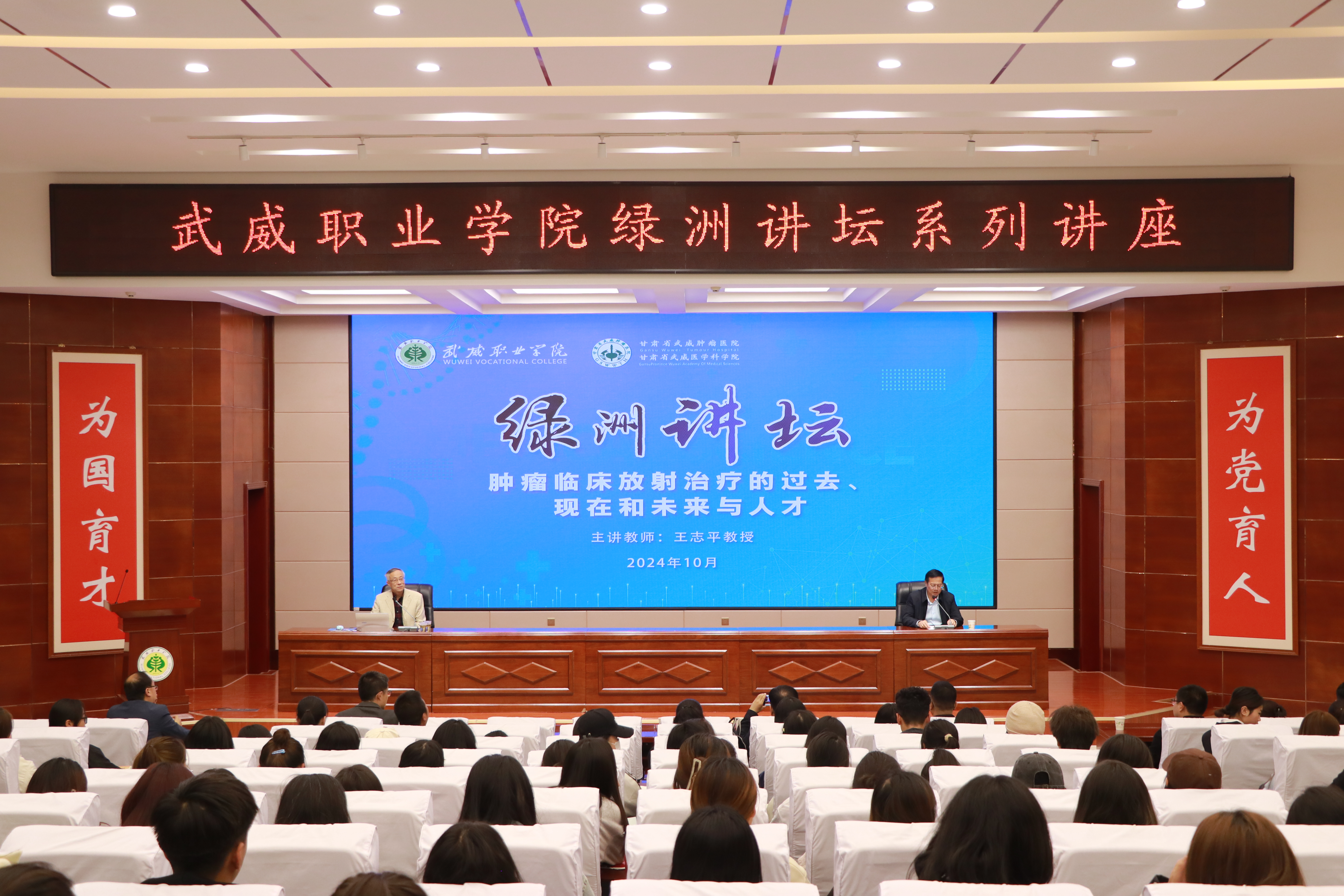 報告會由學校校長、黨委副書記張開禮主持,特邀蘭州大學第二醫(yī)院王志平教授作了“腫瘤臨床放射治療的過去、現(xiàn)在和未來與人才”的主題講座,甘肅省武威醫(yī)學科學院腫瘤醫(yī)院醫(yī)護人員代表、蘭州大學實習生代表和學校師生代表共計220余人參加了報告會。