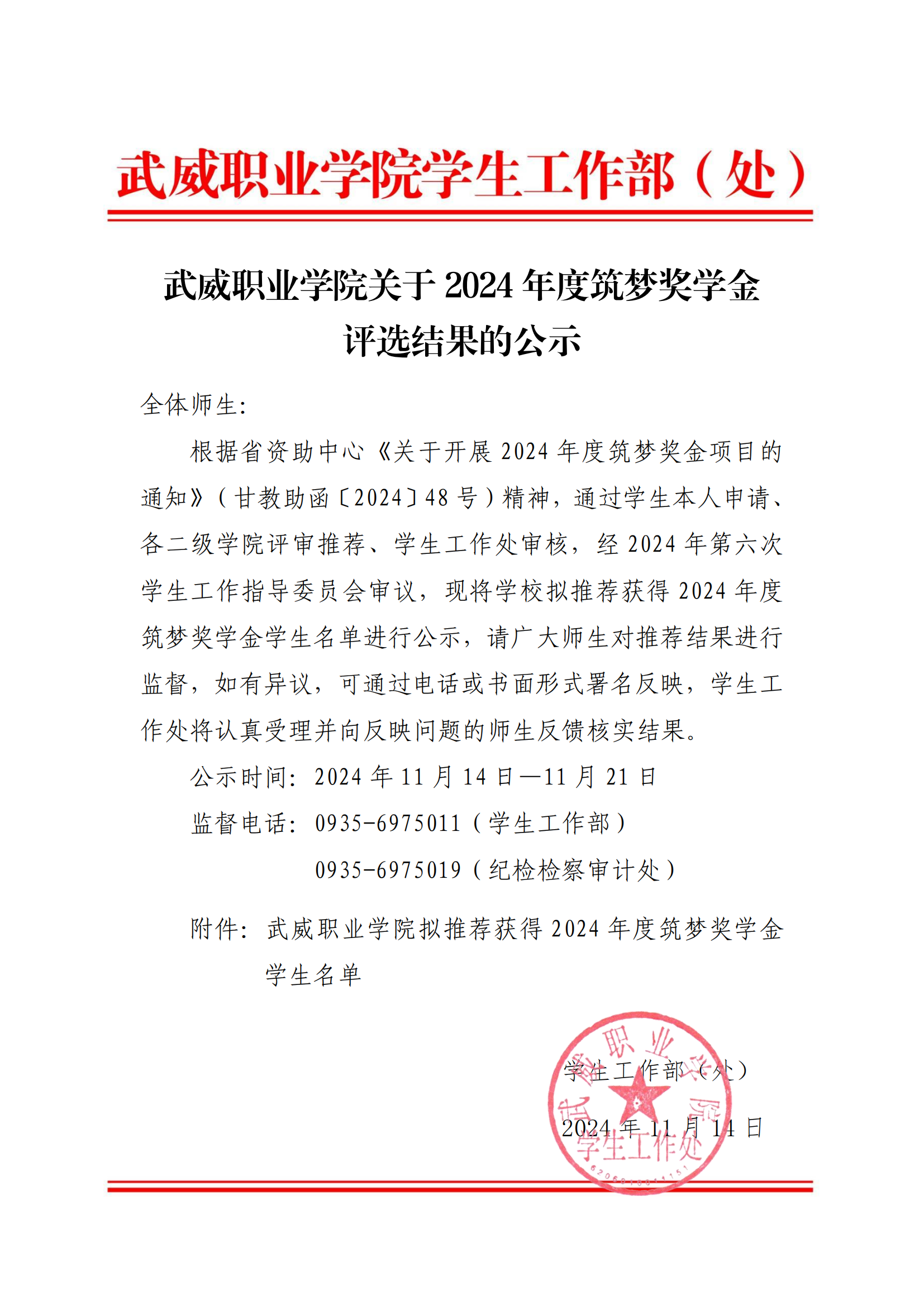 武威職業(yè)學(xué)院關(guān)于2024年度筑夢獎(jiǎng)學(xué)金評選結(jié)果的公示