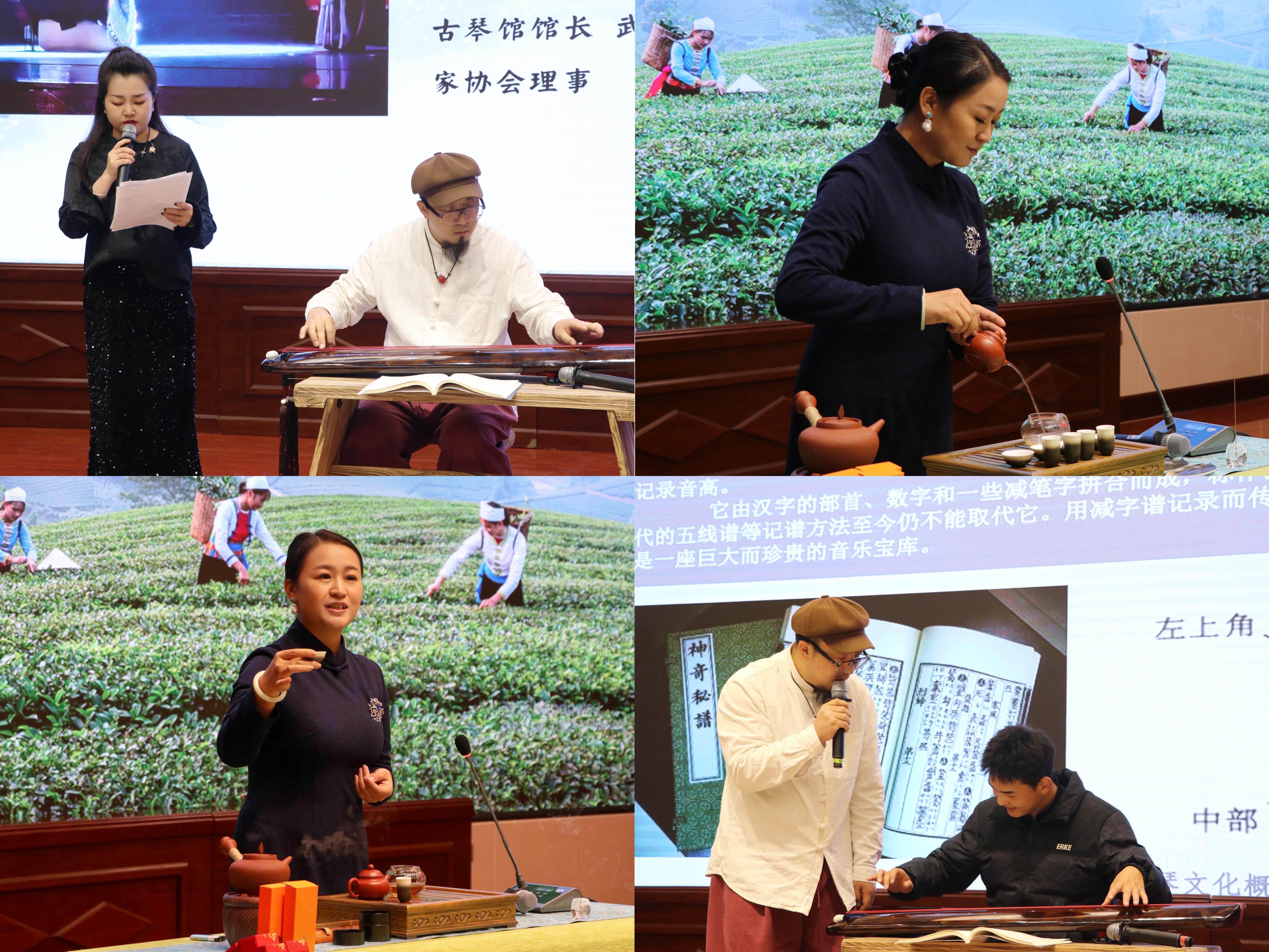 活動中,武威市青年音樂家協(xié)會聲樂學會會長陳菲和古琴協(xié)會會長霍宏昌共同奏唱多首經(jīng)典作品。琴聲悠揚,旋律動人,將現(xiàn)場聽眾帶入古代文人雅士的詩意世界。武威市古琴協(xié)會茶道學會主任白煜為現(xiàn)場觀眾表演“臺灣21式功夫茶”茶藝,白老師從茶葉的種植、采摘到?jīng)_泡技巧,再到品茶的心境,展示了中國功夫茶的沖泡流程與品鑒方法,分享了中國茶文化的歷史與精髓。