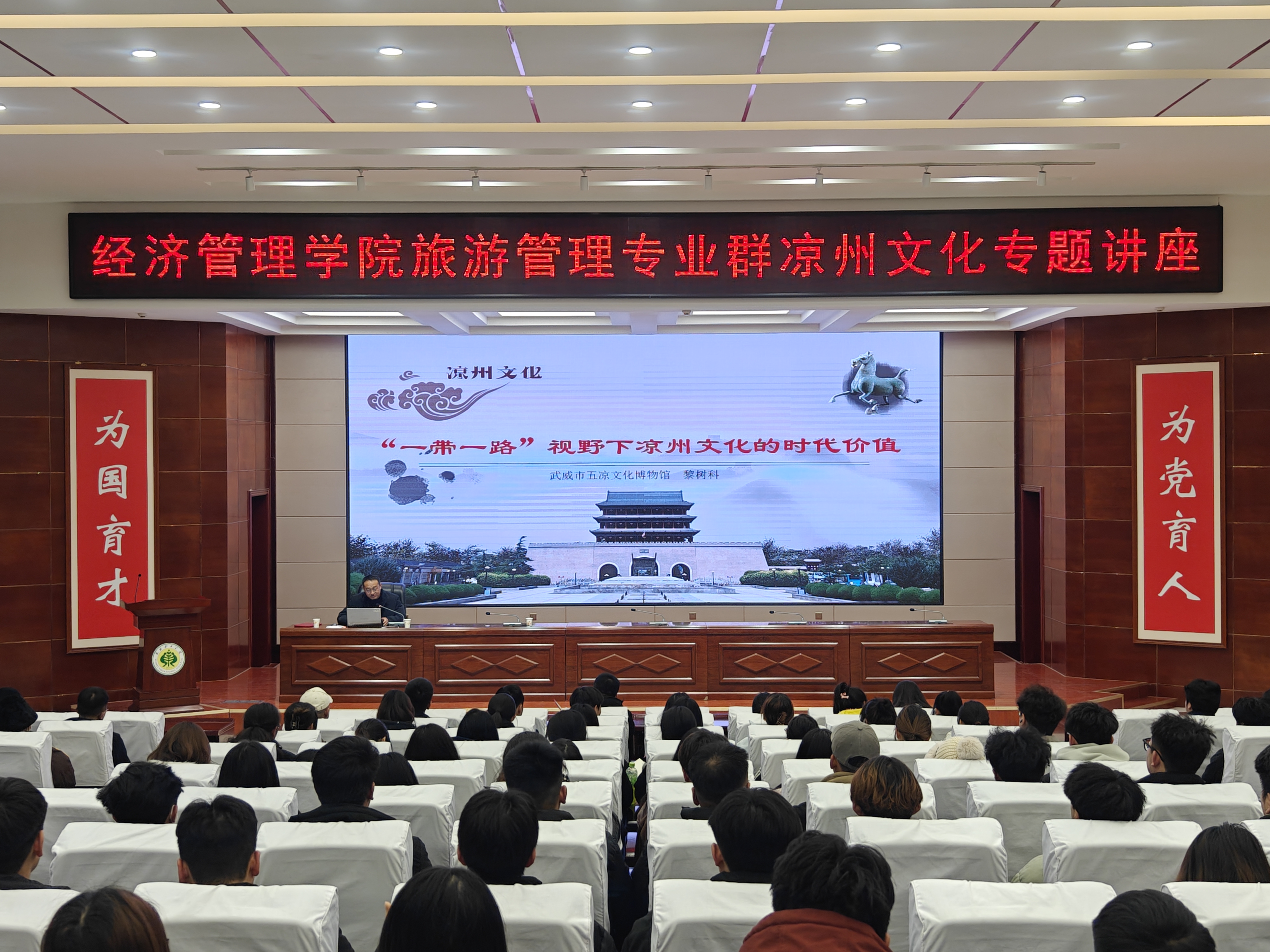 12月11日下午,經(jīng)濟(jì)管理學(xué)院邀請武威市五涼文化博物館館長黎樹科開展了以《“一帶一路” 視野下涼州文化的時代價值》為主題的講座,旨在深入貫徹文化傳承發(fā)展戰(zhàn)略,加強(qiáng)傳統(tǒng)文化的弘揚與教育。學(xué)院近200名師生參加此次講座。