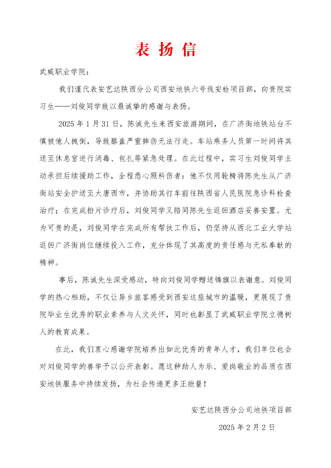 實(shí)習(xí)單位安藝達(dá)陜西分公司地鐵項目部在表揚(yáng)信中特別指出:“劉俊同學(xué)在突發(fā)事件中表現(xiàn)出的應(yīng)急處理能力、人文關(guān)懷意識及高度的責(zé)任感,正是新時代地鐵服務(wù)者應(yīng)有的職業(yè)風(fēng)范?!?/p>