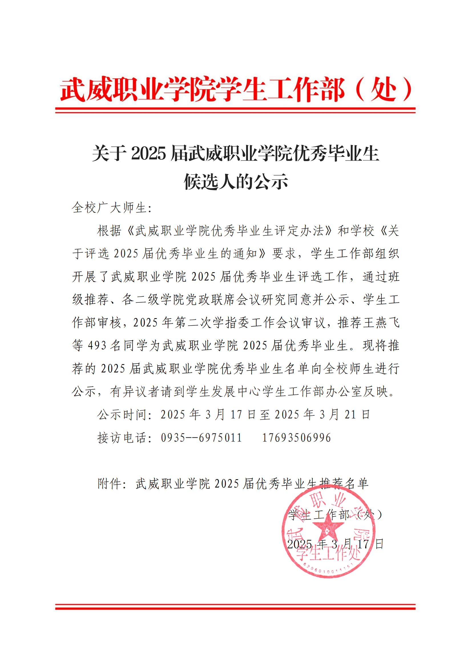 關(guān)于2025屆武威職業(yè)學院優(yōu)秀畢業(yè)生候選人的公示