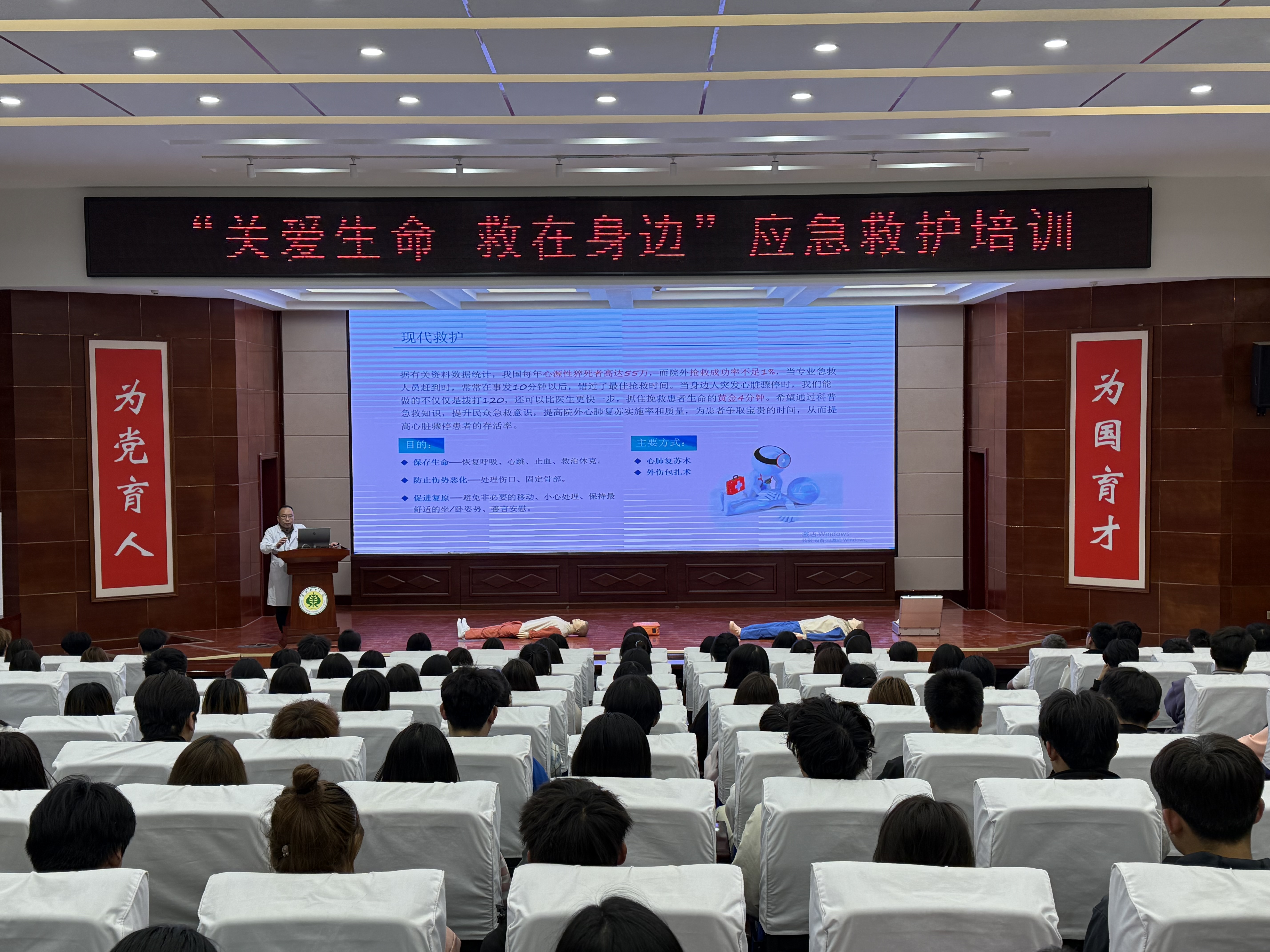 在理論環(huán)節(jié),武威市人民醫(yī)院急診科劉主任圍繞現(xiàn)代救護(hù)理念展開講解,重點(diǎn)強(qiáng)調(diào)“黃金4分鐘”在心肺復(fù)蘇中的關(guān)鍵作用,并詳細(xì)解讀心肺復(fù)蘇(CPR)操作流程、AED使用規(guī)范、海姆立克急救法及創(chuàng)傷救護(hù)技術(shù)。結(jié)合真實(shí)案例,劉主任糾正了“掐人中急救”“盲目搬動(dòng)傷者”等常見誤區(qū),通過視頻演示和互動(dòng)問答,幫助同學(xué)們掌握科學(xué)施救要點(diǎn)?!凹本仁敲總€(gè)公民的社會(huì)責(zé)任,關(guān)鍵時(shí)刻能挽救生命?!眲⒅魅蔚闹v解深入淺出,現(xiàn)場(chǎng)學(xué)生認(rèn)真記錄,積極提問。?