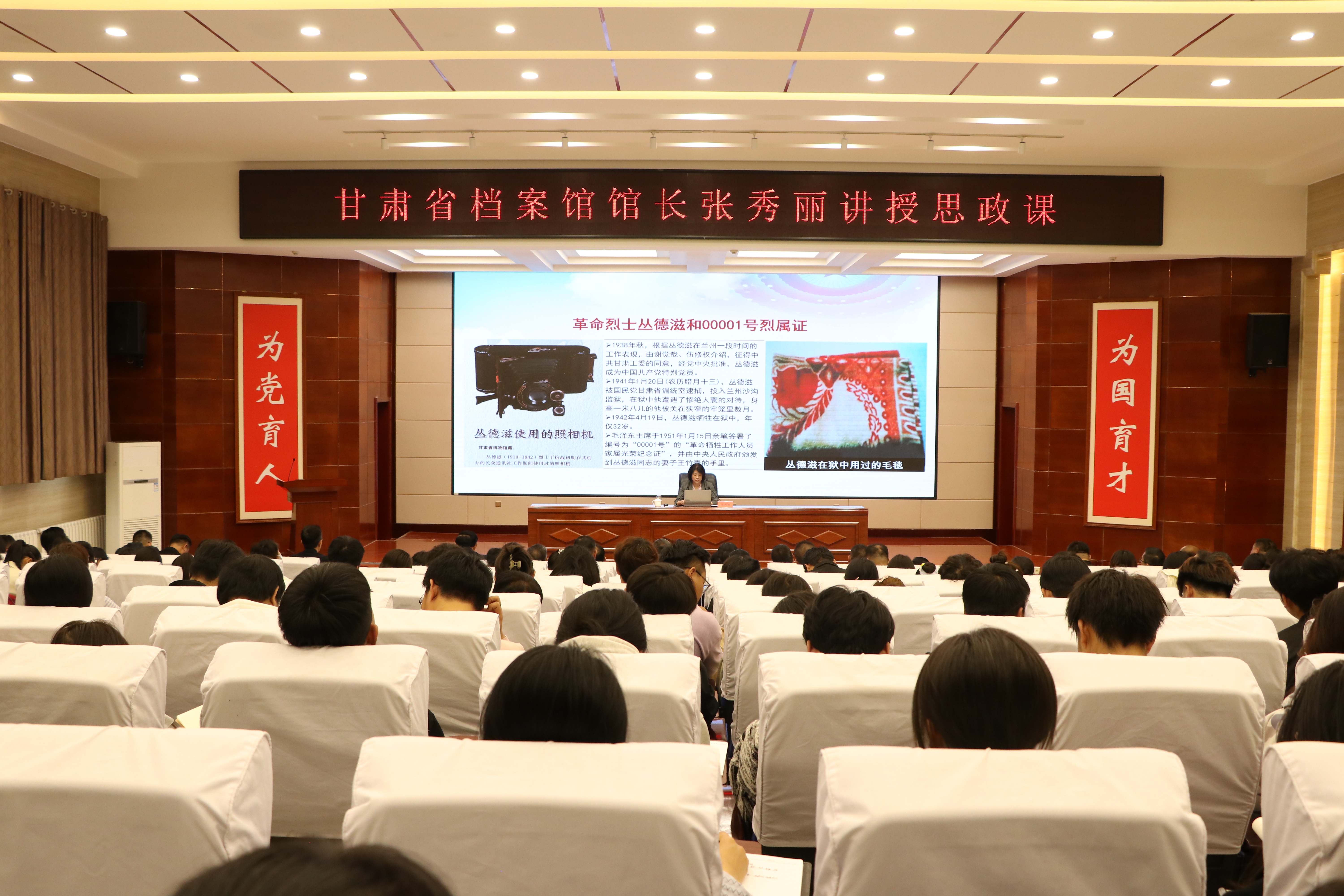 張秀麗結(jié)合自身從事檔案管理和文化研究的豐富經(jīng)驗,從檔案“存史、資政、育人”根本任務(wù)出發(fā),通過大量珍貴檔案文獻(xiàn)和歷史案例,系統(tǒng)闡述了檔案在記錄民族苦難輝煌、服務(wù)當(dāng)代治國理政、培育時代新人中的重要作用。報告中,她以館藏漢代簡牘、革命烈士叢德滋00001號烈屬證、民勤治沙檔案、甘肅地震檔案等一批具有歷史代表性和地域特色的檔案為載體,帶領(lǐng)師生穿越時空,感受中華民族生生不息的精神力量,深刻解讀“勿忘昨天的苦難輝煌,無愧今天的使命擔(dān)當(dāng),不負(fù)明天的偉大夢想”的時代內(nèi)涵。