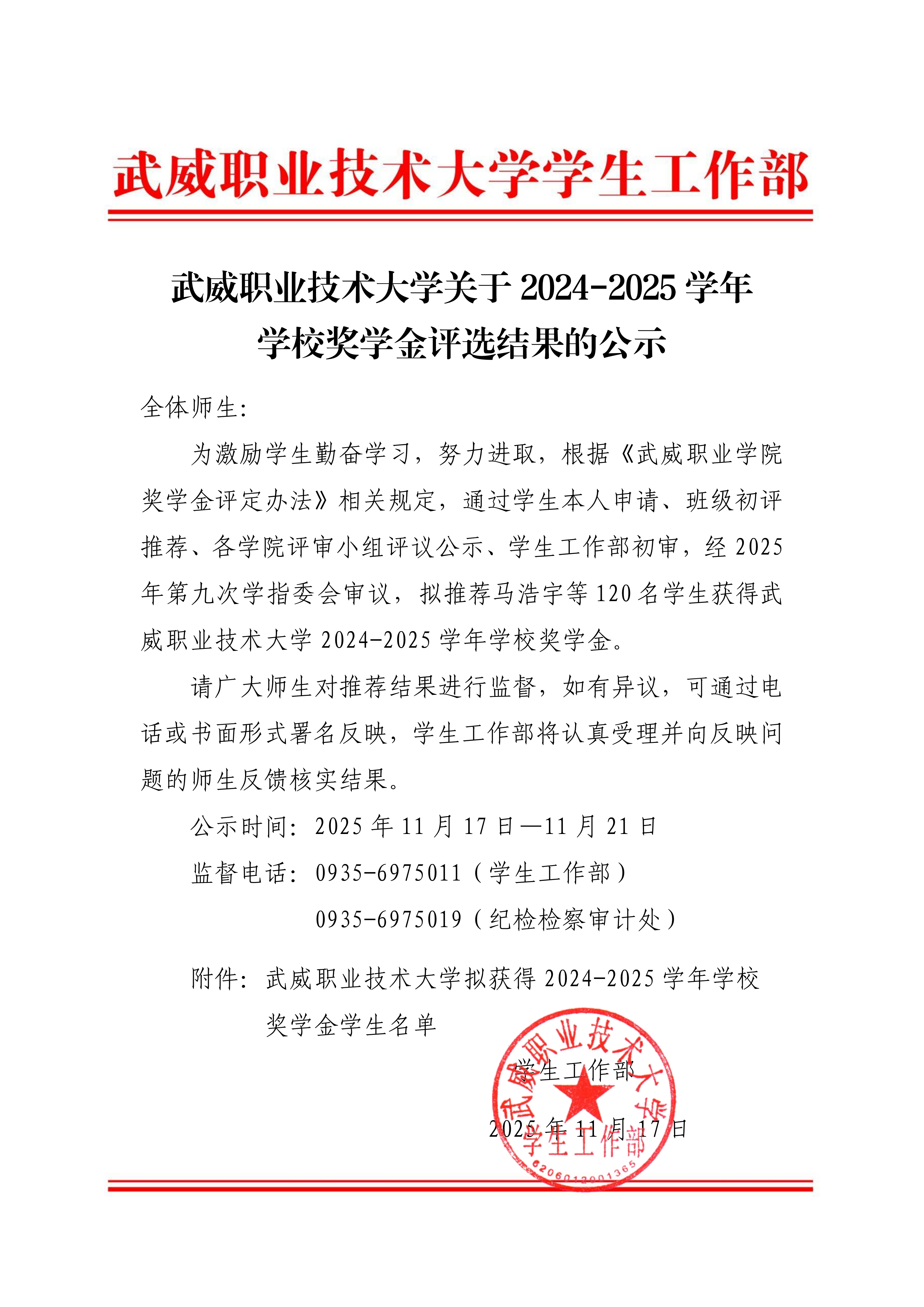 武威職業(yè)技術(shù)大學(xué)關(guān)于2025年學(xué)校助學(xué)金評選結(jié)果的公示