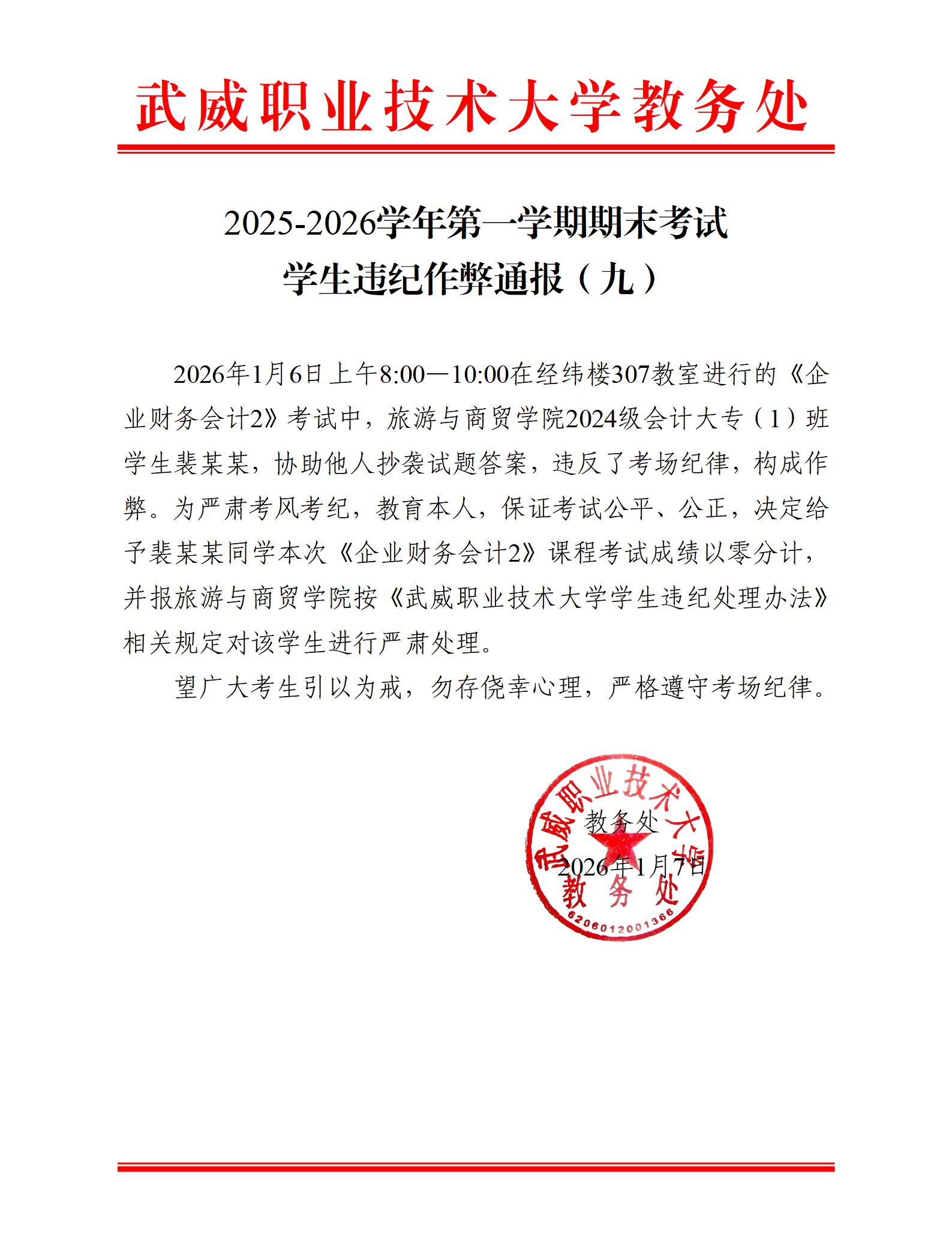 2025-2026學(xué)年第一學(xué)期期末考試學(xué)生違紀(jì)作弊通報(bào)(九)