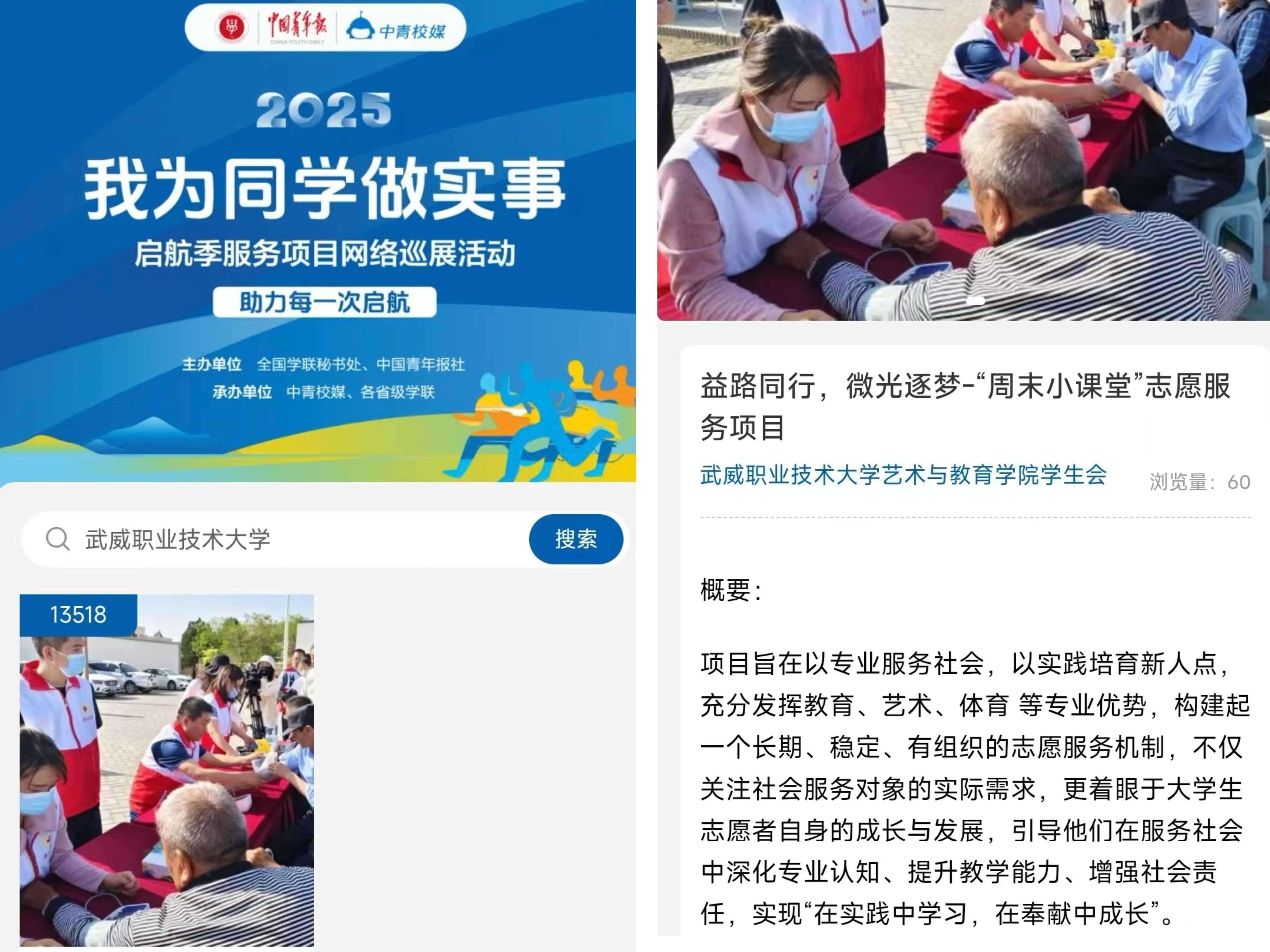 近日,由共青團(tuán)中央指導(dǎo),全國學(xué)聯(lián)秘書處與中國青年報(bào)、中青校媒聯(lián)合發(fā)起的全國高校學(xué)生會組織“我為同學(xué)做實(shí)事”啟航季服務(wù)項(xiàng)目網(wǎng)絡(luò)巡展活動公布入選名單。藝術(shù)與教育學(xué)院學(xué)生會申報(bào)的“益路同行,微光筑夢”周末小課堂服務(wù)項(xiàng)目從全國896所院校的1662個項(xiàng)目中脫穎而出。