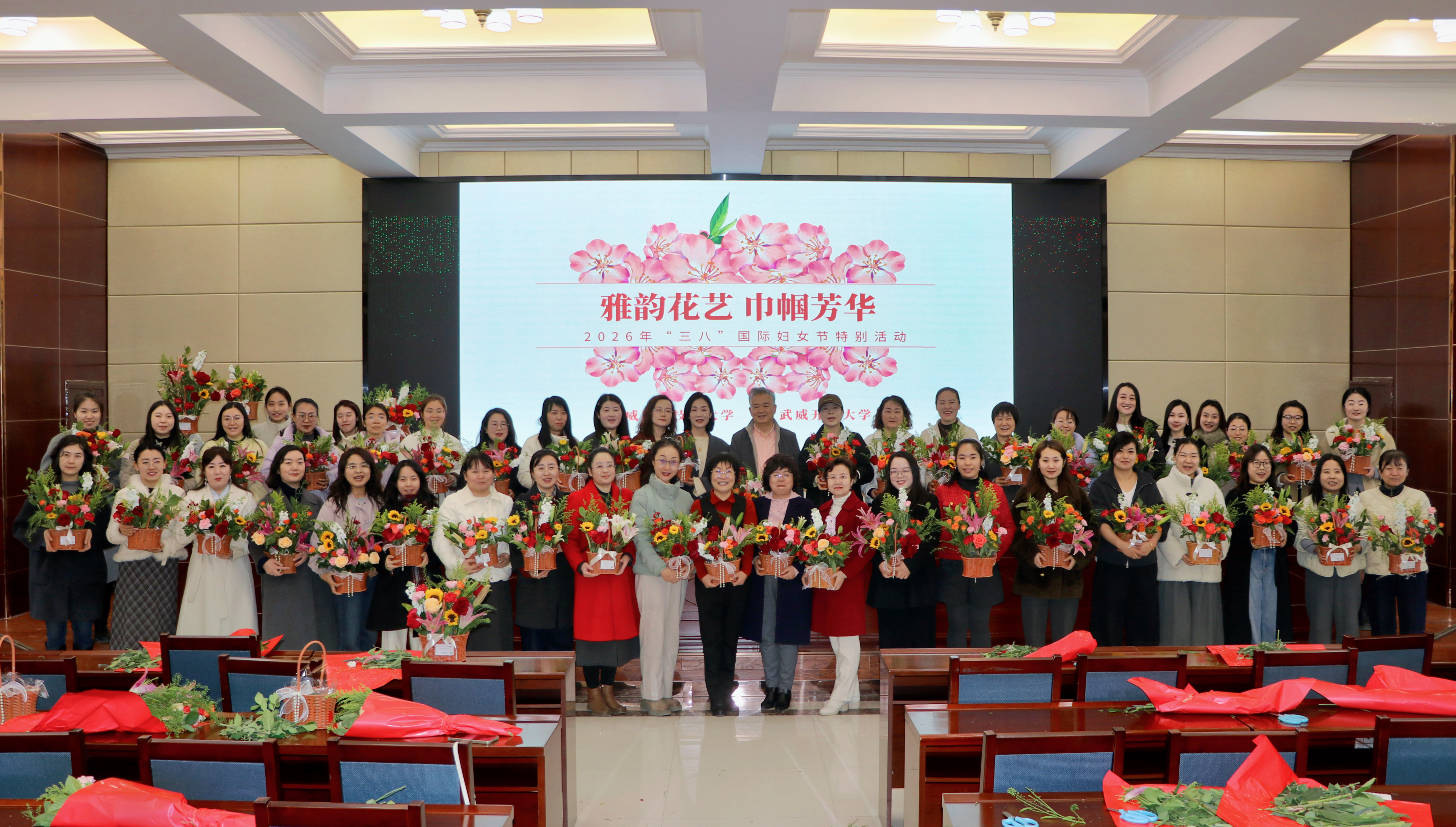 為慶祝第116個(gè)“三八”國際勞動(dòng)?jì)D女節(jié),3月6日,學(xué)校工會(huì)聯(lián)合武威開放大學(xué),在行樹樓北側(cè)報(bào)告廳組織開展了以“雅韻花藝?巾幗芳華”為主題的插花活動(dòng),130余名女教職工歡聚一堂、共赴花約。黨委委員、副校長何毅出席活動(dòng)并致辭。