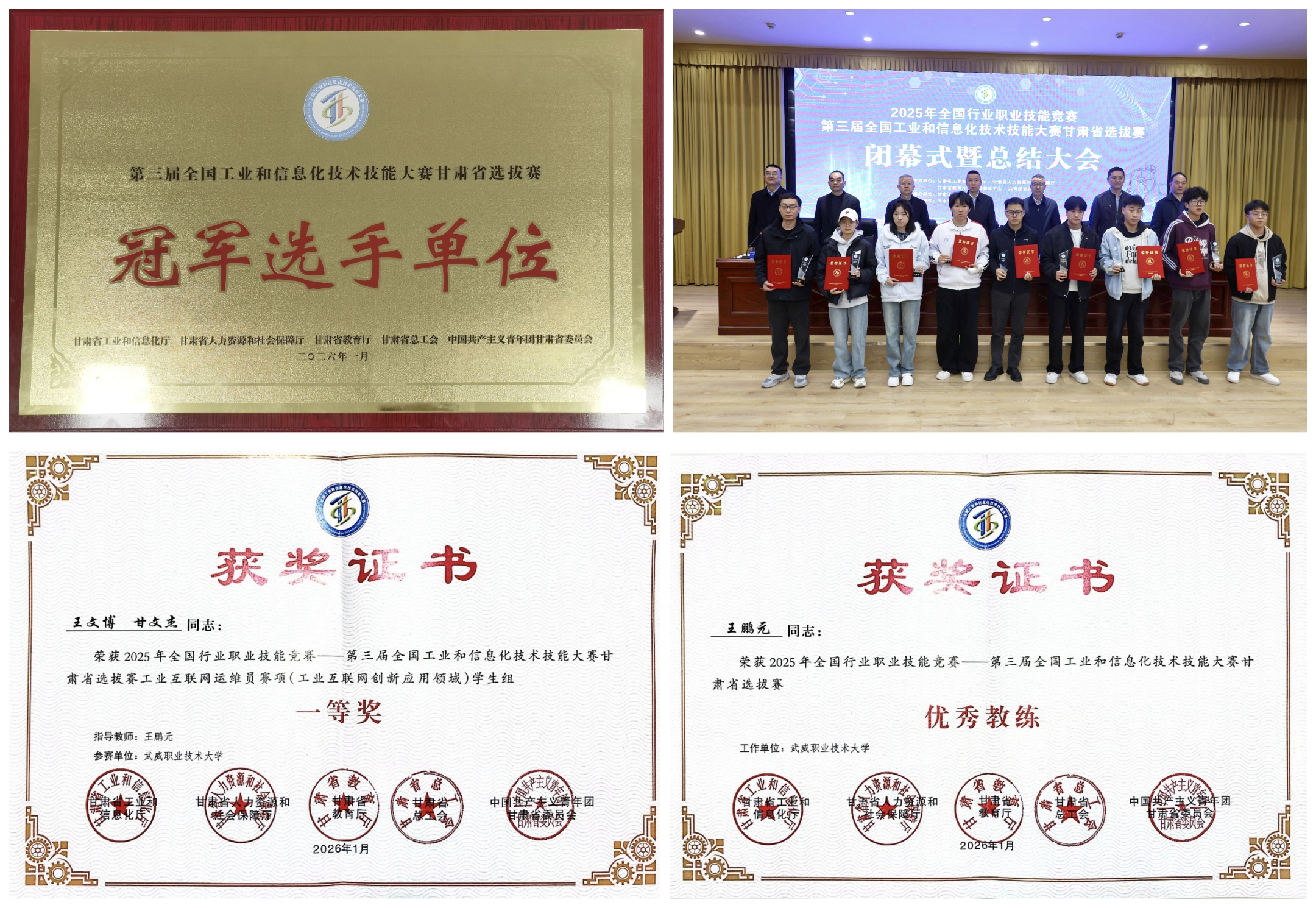 近日,2025年全國行業(yè)職業(yè)技能競賽——第三屆全國工業(yè)和信息化技術(shù)技能大賽甘肅省選拔賽在甘肅工業(yè)職業(yè)技術(shù)大學(xué)順利閉幕。我校信息技術(shù)學(xué)院參賽選手王文博、甘文杰憑借其扎實(shí)的專業(yè)基礎(chǔ)、精湛的操作技藝與穩(wěn)健的臨場表現(xiàn),在激烈競爭中脫穎而出,榮獲大賽一等獎(jiǎng),我校被授予“冠軍選手單位”榮譽(yù)稱號(hào)。