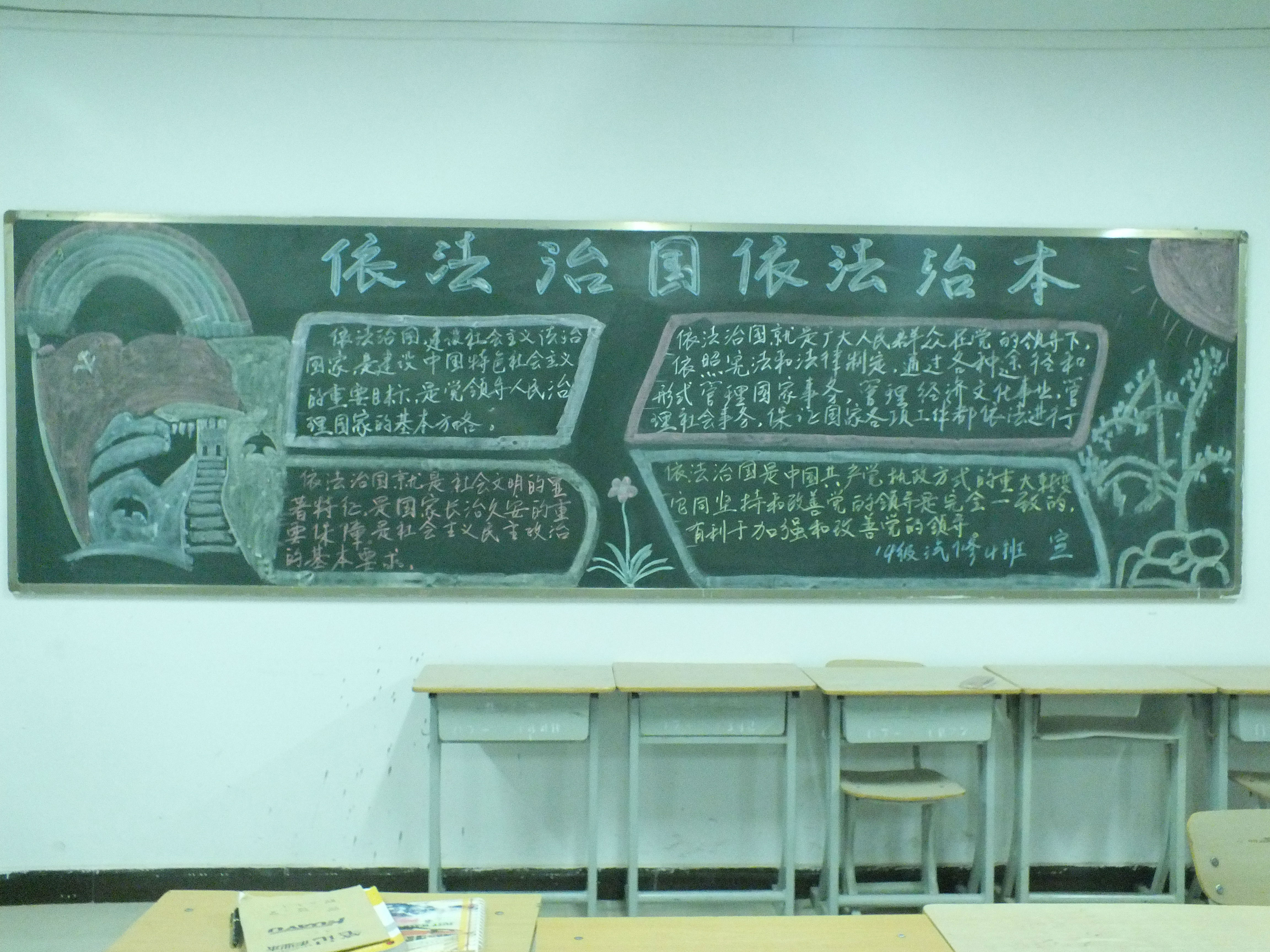各班通過(guò)召開(kāi)普法教育主題班會(huì);以“普法校園行”為主題出黑板報(bào);舉辦“弘揚(yáng)憲法精神、建設(shè)法治校園”專(zhuān)題講座等形式向同學(xué)們宣傳十八屆三中、四中全會(huì)和習(xí)近平總書(shū)記系列重要講話(huà)精神;宣傳法治教育在推進(jìn)法治校園建設(shè)中的基礎(chǔ)作用;宣傳開(kāi)展法治教育的新思路、新方法、新成效;宣傳深化法治文化、法治創(chuàng)建、依法治理等活動(dòng)的成功經(jīng)驗(yàn)、典型實(shí)例和亮點(diǎn)工作;宣傳法治教育工作中涌現(xiàn)的先進(jìn)人物和學(xué)法守法典型等。