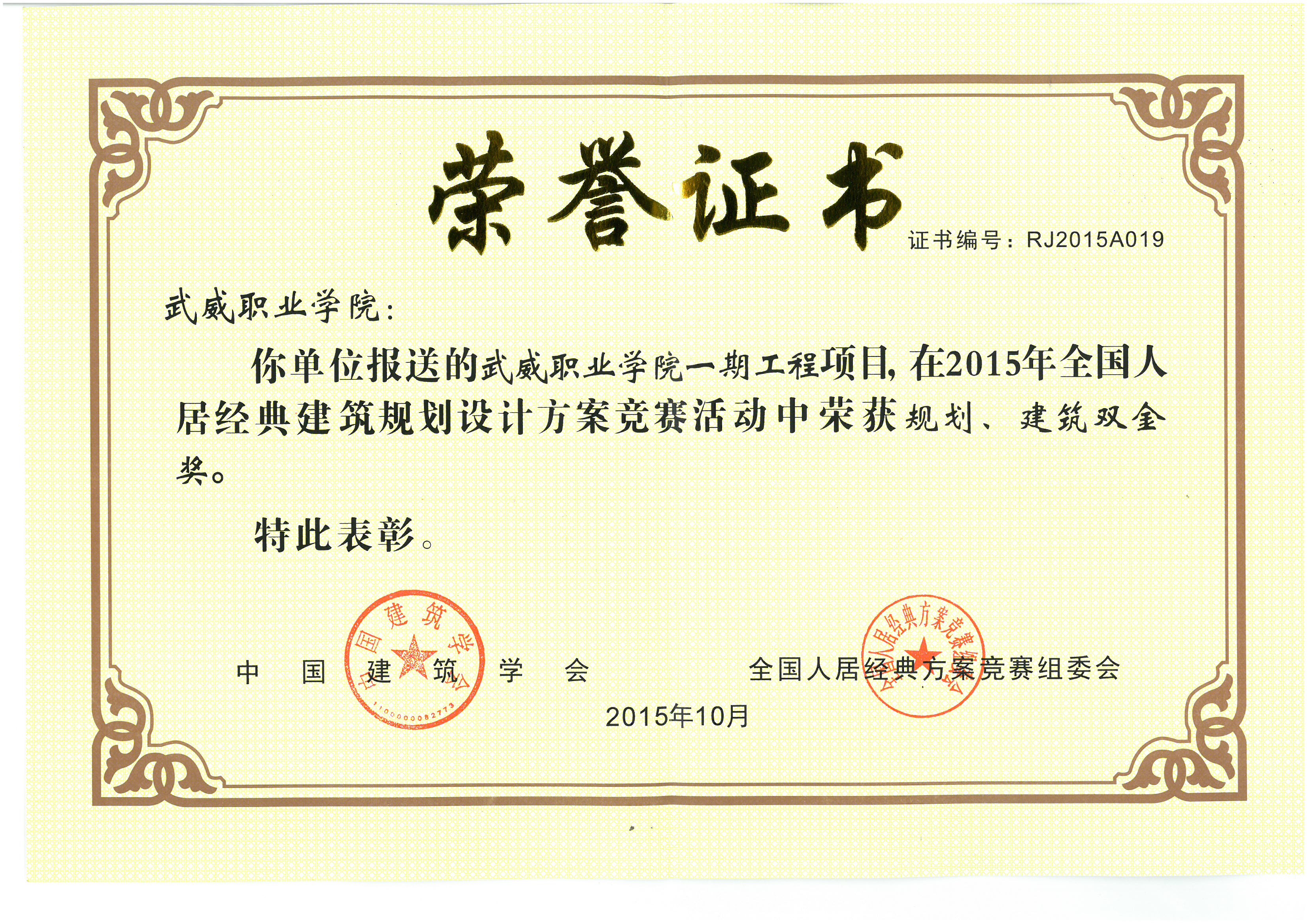 2015年10月,第十五屆全國人居經(jīng)典建筑規(guī)劃設(shè)計方案競賽結(jié)果在北京揭曉,我院報送的武威職業(yè)學(xué)院一期擴建項目在全國眾多參賽項目中脫穎而出,榮膺規(guī)劃、建筑雙金獎。全國人居經(jīng)典方案競賽由中國建筑學(xué)會主辦,全國人居經(jīng)典方案競賽組委會承辦,自2001年起每年舉辦一屆,參賽項目覆蓋全國所有省份及港澳臺地區(qū),評審專家皆為業(yè)界權(quán)威,獲獎難度大,權(quán)威性高。榮膺規(guī)劃、建筑雙金獎是武威建筑項目上的首次。