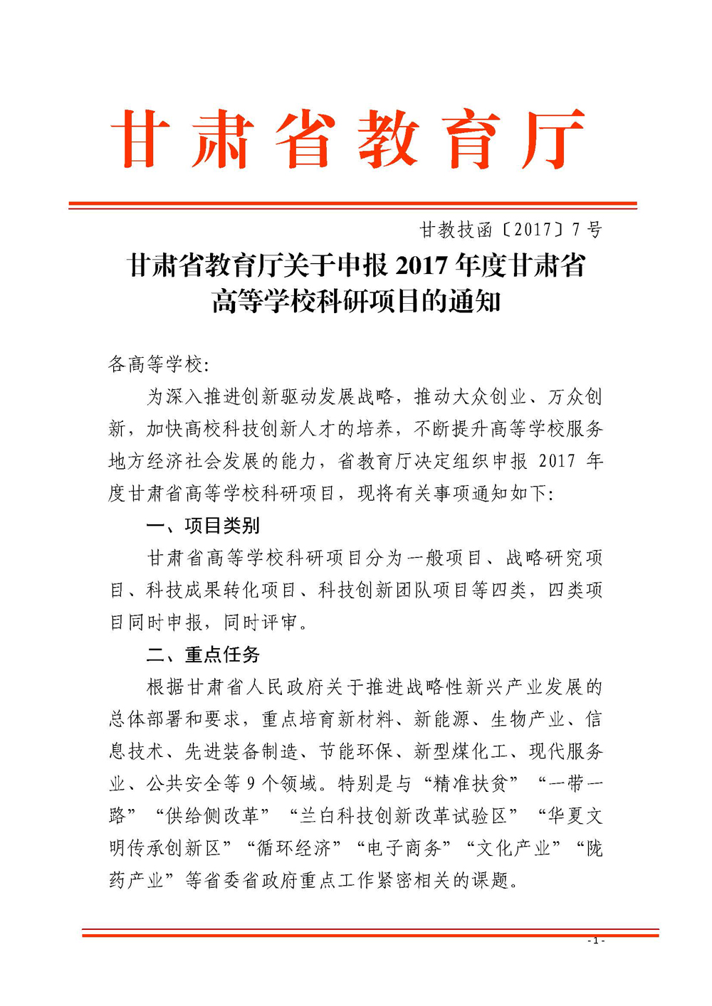 甘肅省教育廳關(guān)于申報2017年度甘肅省高等學(xué)校科研項目的通知