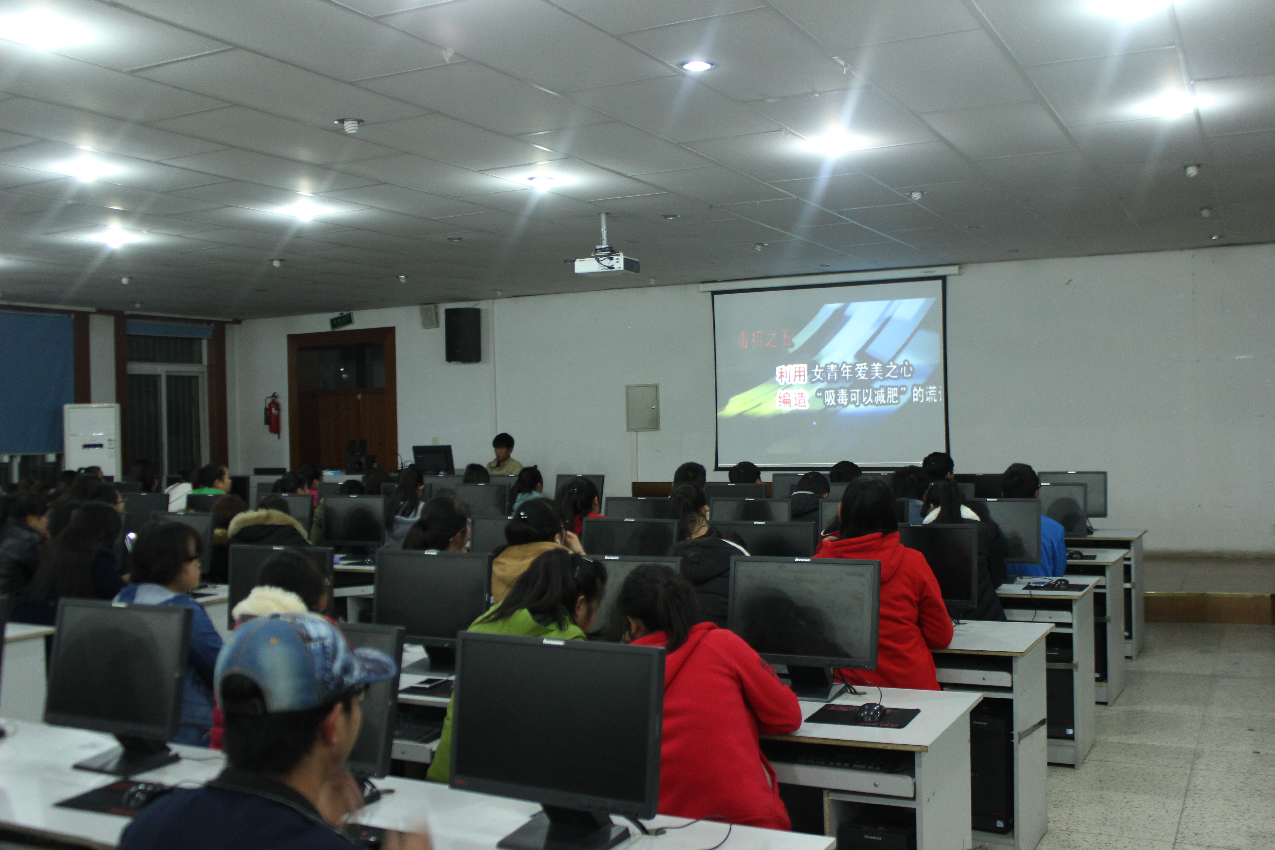 為進(jìn)一步提高大學(xué)生的禁毒意識(shí)和拒毒能力,切實(shí)加強(qiáng)毒品預(yù)防教育,貫徹落實(shí)《武威職業(yè)學(xué)院關(guān)于開(kāi)展禁毒“五個(gè)一”活動(dòng)的通知》的要求,12月2日晚8時(shí),電子信息工程系組織學(xué)生代表200余人在尚德樓十一號(hào)機(jī)房觀看毒品危害的主題電影。