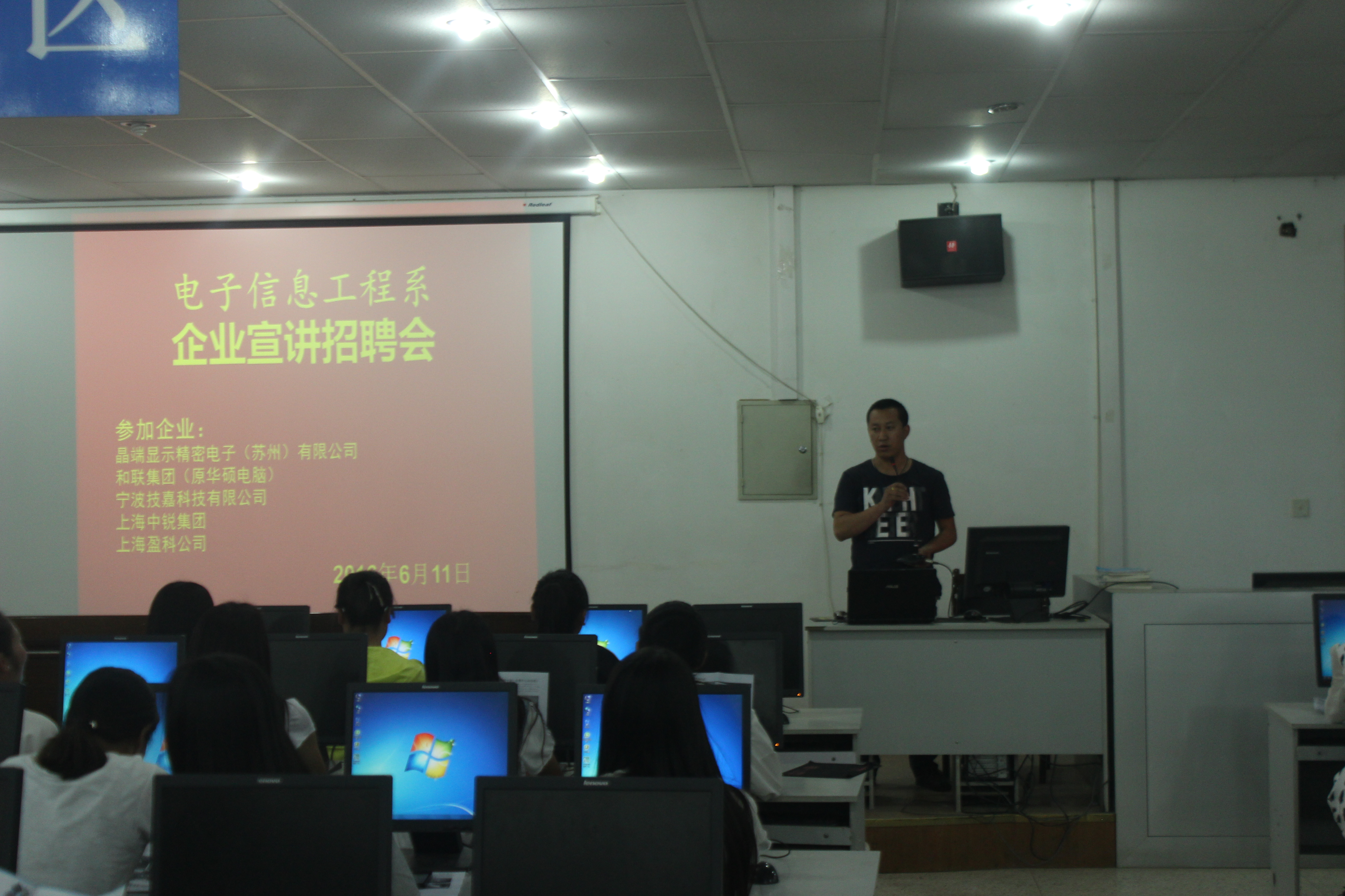 為更好的做好2014級(jí)學(xué)生頂崗實(shí)習(xí)的工作,6月11日,電子信息工程系在學(xué)院十號(hào)機(jī)房舉辦了企業(yè)專場招聘會(huì),2014級(jí)全體學(xué)生參加了招聘會(huì)。參會(huì)的五家企業(yè)是:晶端顯示精密電子(蘇州)有限公司、上海中銳集團(tuán)、寧波技嘉科技有限公司、和聯(lián)集團(tuán)(原華碩電腦)和上海電訊盈科公司。