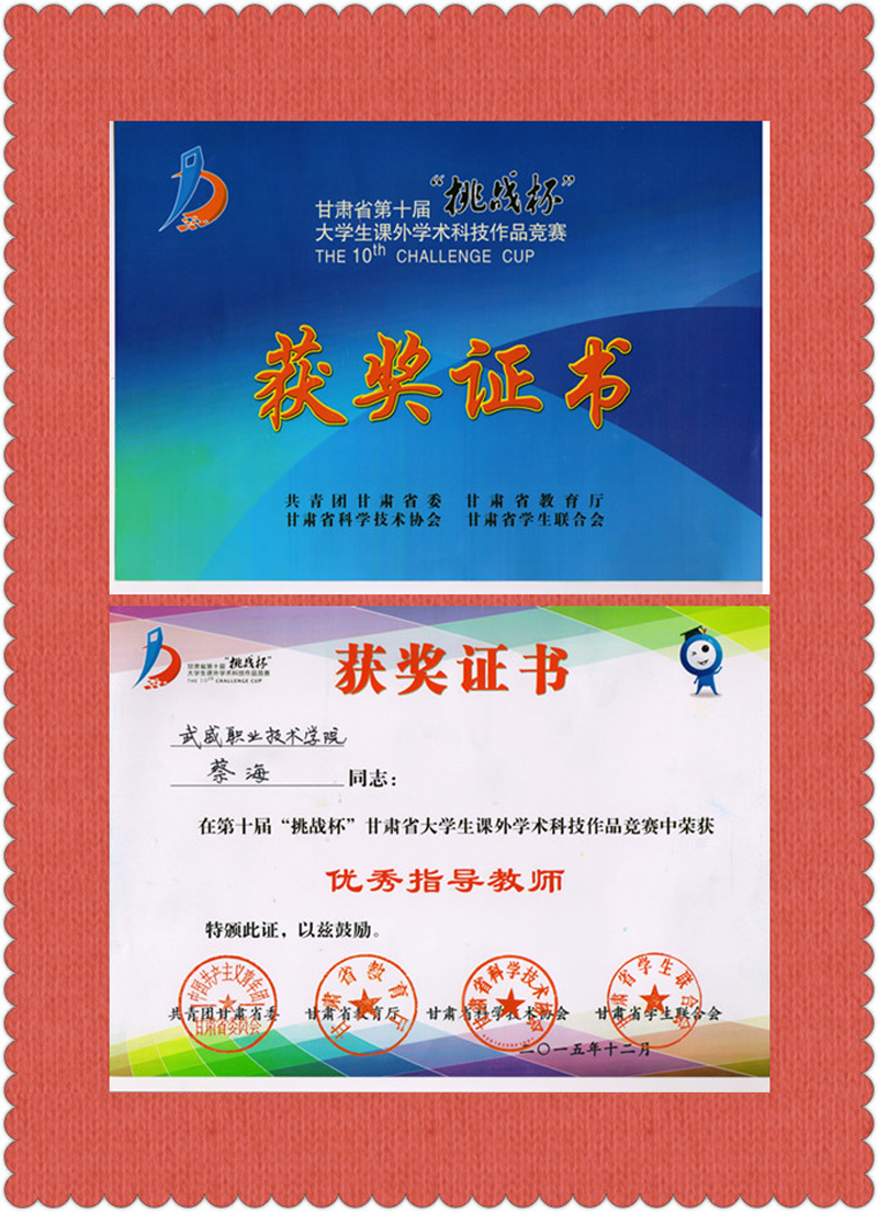 2015年6月23日,現代農業(yè)技術系教師蔡海、李強棟赴西北師范大學,參加由共青團甘肅省委、甘肅省教育廳、甘肅省科學技術學會、甘肅省學生聯(lián)合會舉辦的甘肅省第十屆大學生“挑戰(zhàn)杯”大學生課外學術科技作品競賽,獲得優(yōu)秀指導教師榮譽稱號。