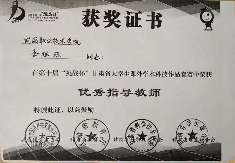 我院教師獲得甘肅省第十屆大學生“挑戰(zhàn)杯”大學生課外學術科技作品競賽優(yōu)秀指導教師榮譽稱號
