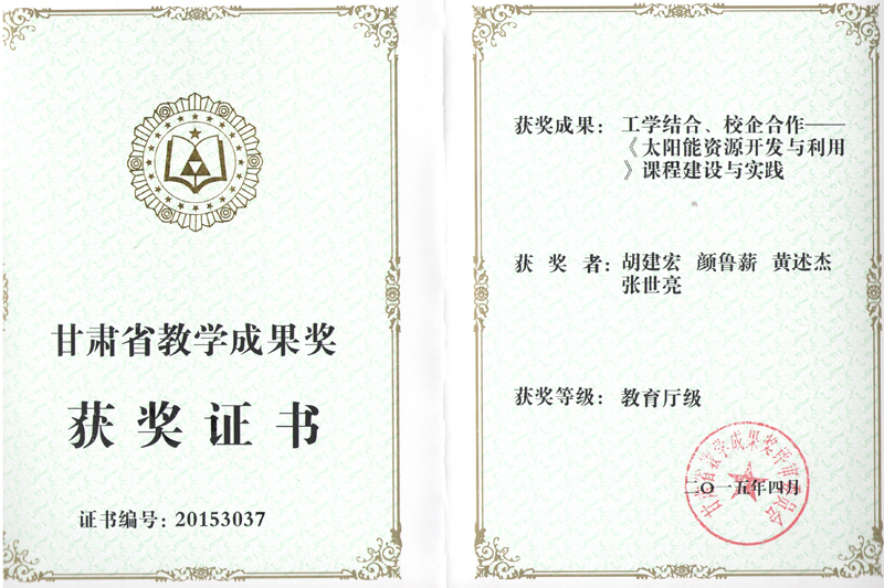 甘肅省教學(xué)成果獎(jiǎng):工學(xué)結(jié)合、校企合作——《太陽能資源開發(fā)與利用》課程建設(shè)與實(shí)踐