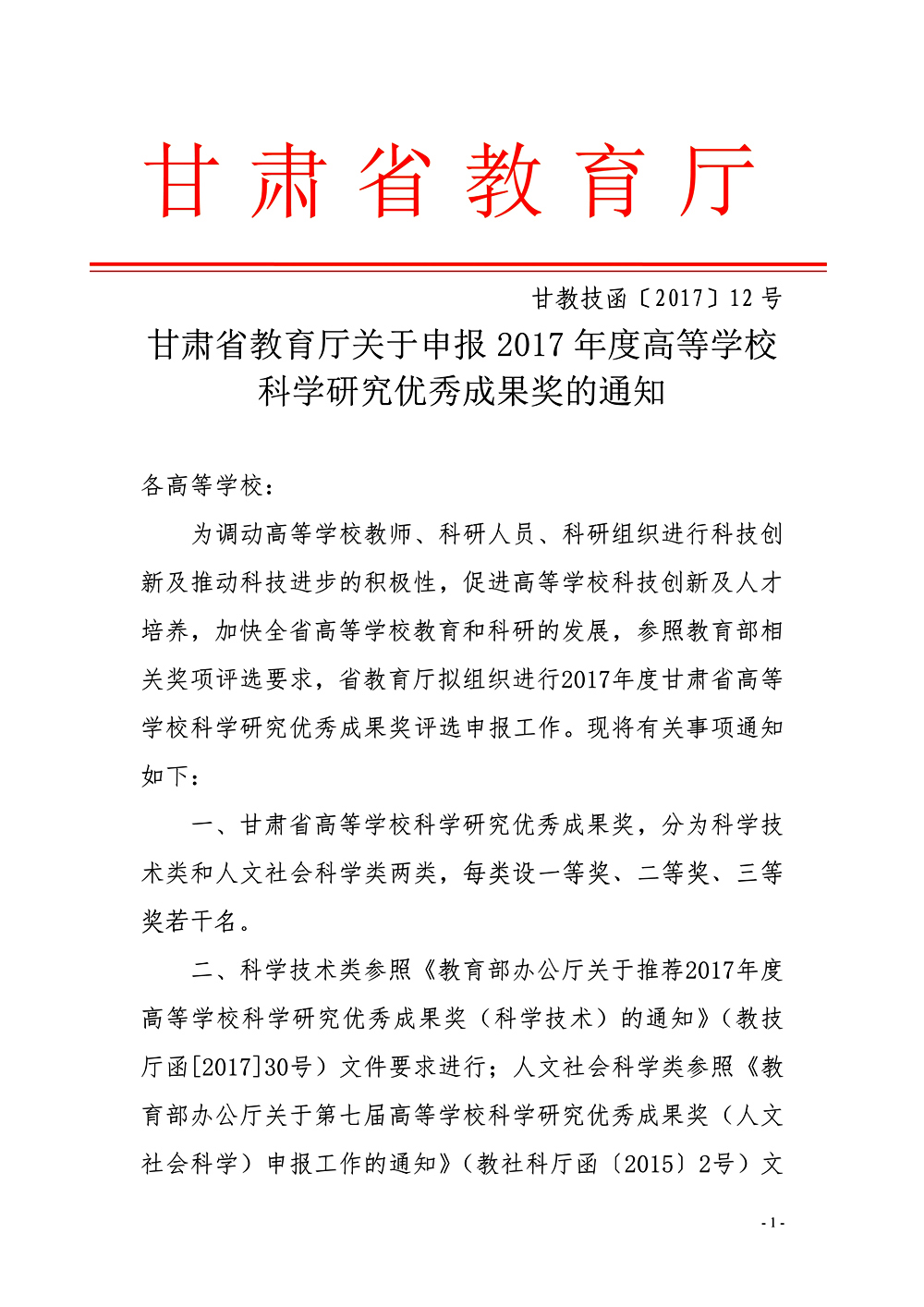 轉(zhuǎn)發(fā)甘肅省教育廳關(guān)于申報(bào)2017年度高等學(xué)??茖W(xué)研究優(yōu)秀成果獎(jiǎng)的通知