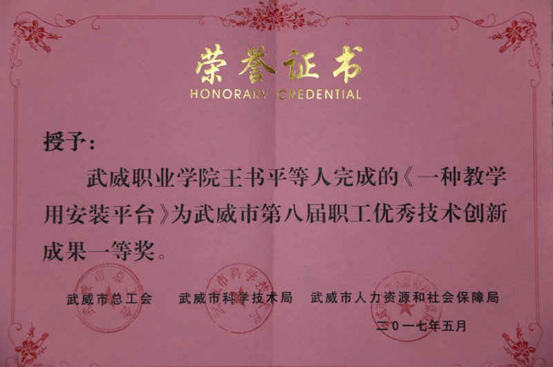 為貫徹落實武威市委、市政府關于《武威市十萬職工職業(yè)技能素質提升活動工作方案(2016-2020年)》(武政辦發(fā)〔201672號)文件精神,推動我市“雙創(chuàng)”工作的深入開展,激發(fā)我市廣大企事業(yè)職工提升技能和開拓創(chuàng)新的熱情。近日,由市總工會、市人社局、市科技局等單位聯(lián)合舉辦了“武威市第八屆職工技術創(chuàng)新成果評選活動”。本屆職工技術創(chuàng)新成果評選共征集創(chuàng)新成果87項,其中:學院推薦了十項研究課題、專利技術項目,王書平團隊《一種教學用安裝平臺》項目成果榮獲一等獎,申賓德團隊《簡易焊工考試用帶坡口鋼板火焰切割下料機的研究與應用》,王勝團隊《“胰美舒”治療2型糖尿病周圍神經病變(氣陰兩虛兼瘀證)的臨床觀察》項目成果榮獲三等獎。