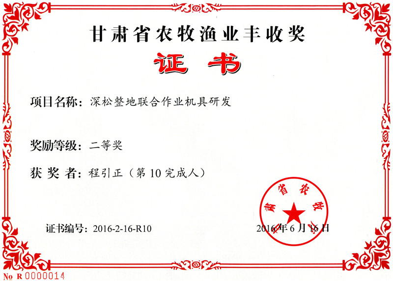 甘肅省農(nóng)牧漁業(yè)豐收獎-深松整地聯(lián)合作業(yè)機具研發(fā)
