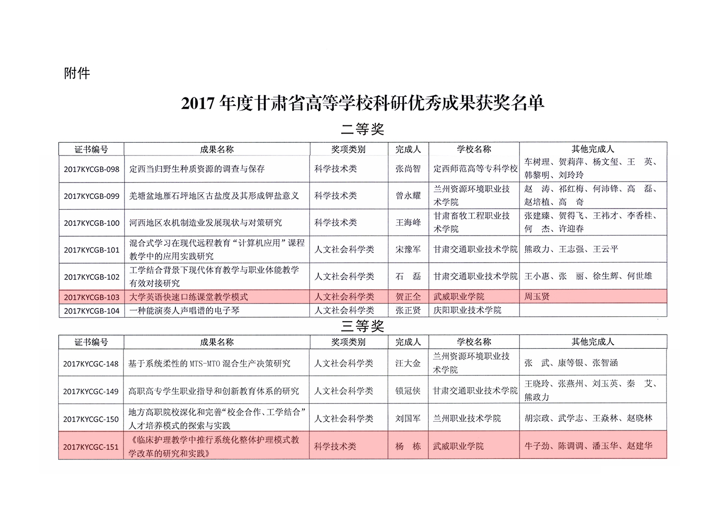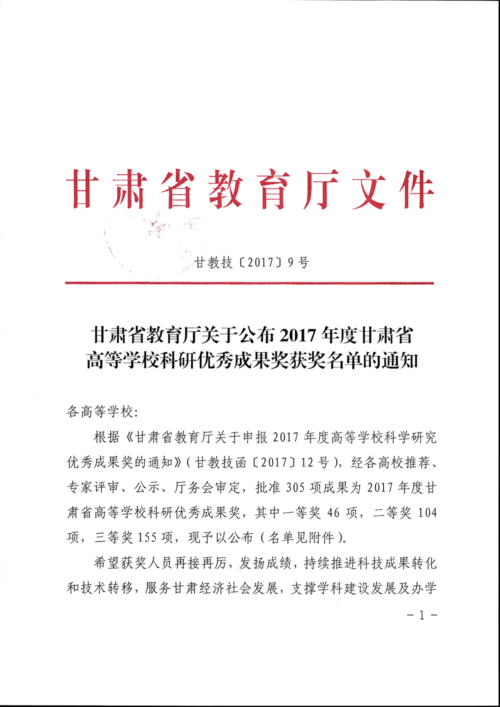 轉發(fā)甘肅省教育廳關于公布2017年度甘肅省高等學??蒲袃?yōu)秀成果獎獲獎名單的通知