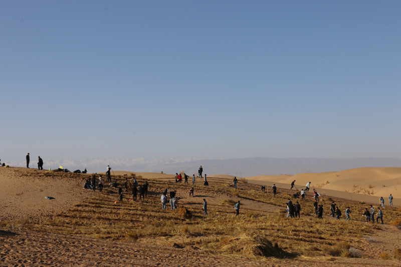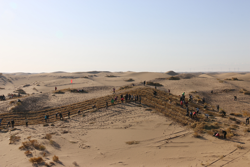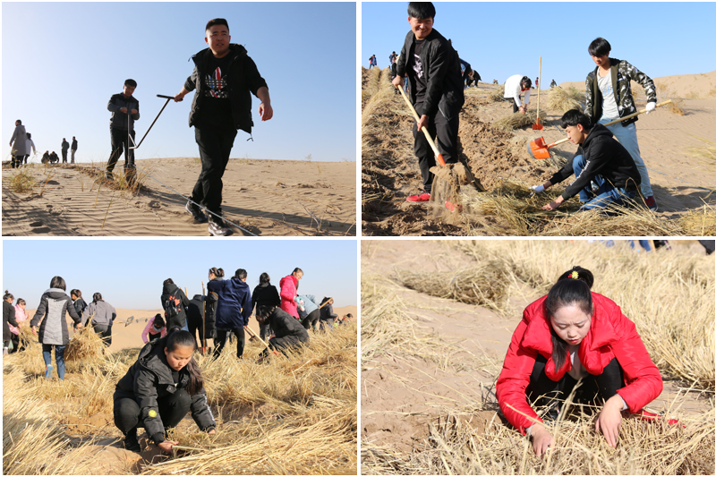 在勞動(dòng)現(xiàn)場(chǎng),學(xué)院領(lǐng)導(dǎo)和師生們不畏冬寒,分工協(xié)作,按照標(biāo)準(zhǔn)和要求劃線開(kāi)溝、蒲草培沙、等距離推進(jìn),現(xiàn)場(chǎng)一片熱火朝天的景象。荒蕪的沙地身披新衣,整齊的稻草方格逐漸向遠(yuǎn)處的沙丘覆蓋。