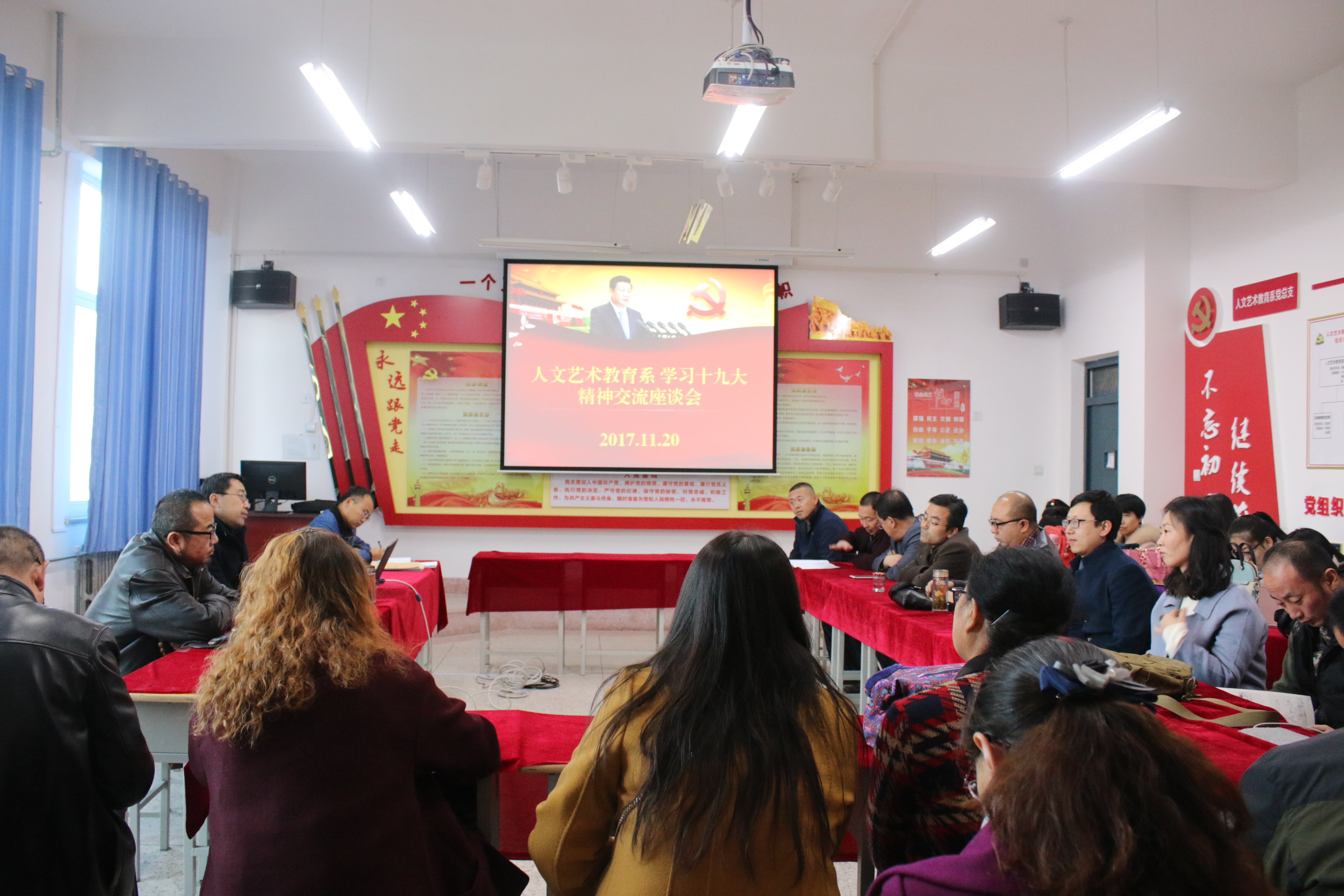 11 月20日,人文藝術教育系黨總支召開了“學習黨的十九大精神 促進我系教育發(fā)展”專題座談會。會議由人文藝術教育系黨總支書記胡靜峰同志主持,系全體教師參加座談會。