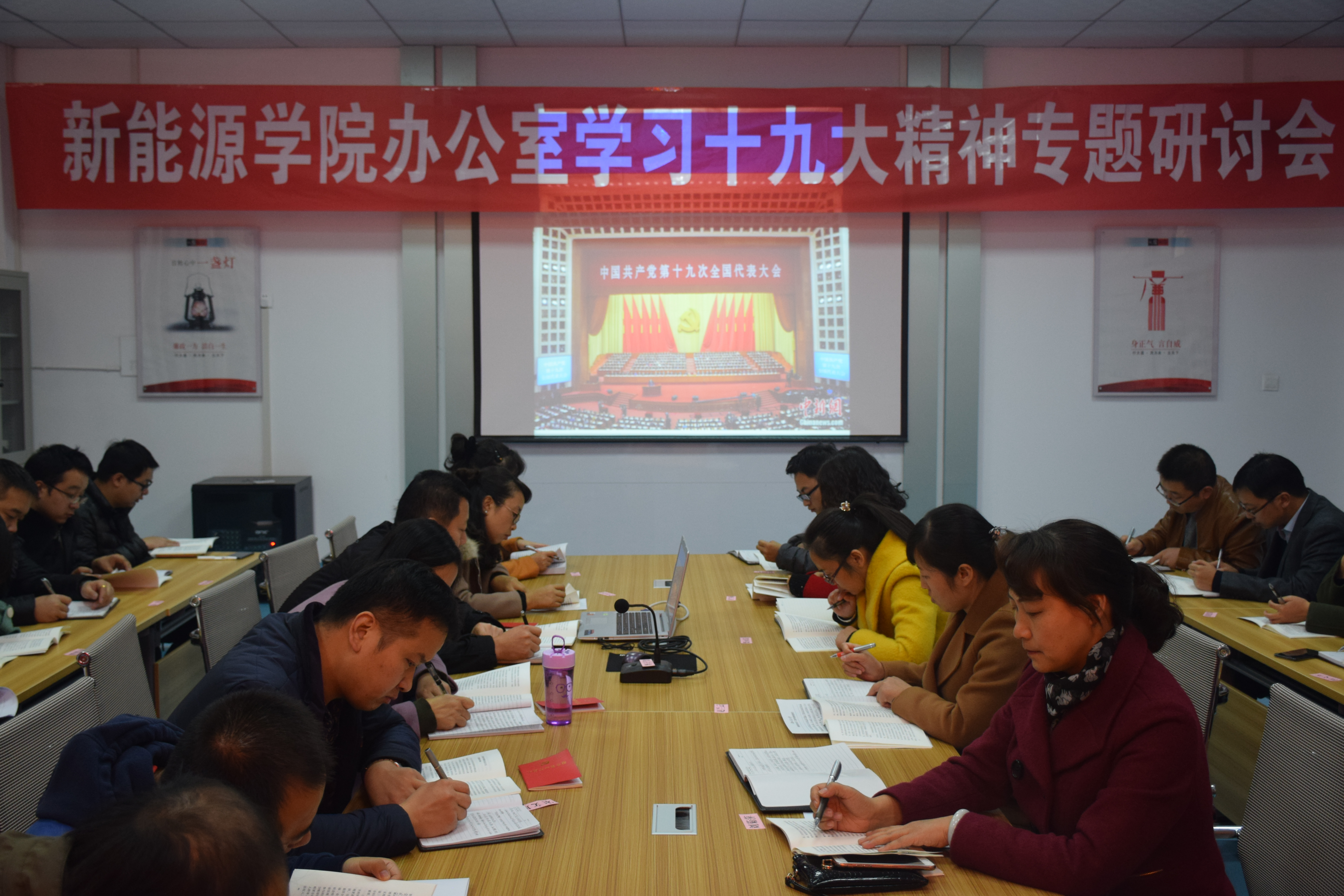 為認(rèn)真學(xué)習(xí)貫徹黨的十九大精神,深入領(lǐng)會(huì)習(xí)近平新時(shí)代中國(guó)特色社會(huì)主義思想,準(zhǔn)確理解和把握新時(shí)代我國(guó)社會(huì)主要矛盾變化以及經(jīng)濟(jì)領(lǐng)域的重大問題。11月23日下午,新能源與動(dòng)力工程學(xué)院組織全體教職工在黨員活動(dòng)室召開學(xué)習(xí)十九大精神專題研討會(huì)。會(huì)議由新能源與動(dòng)力工程學(xué)院辦公室黨支部書記任陶主持。